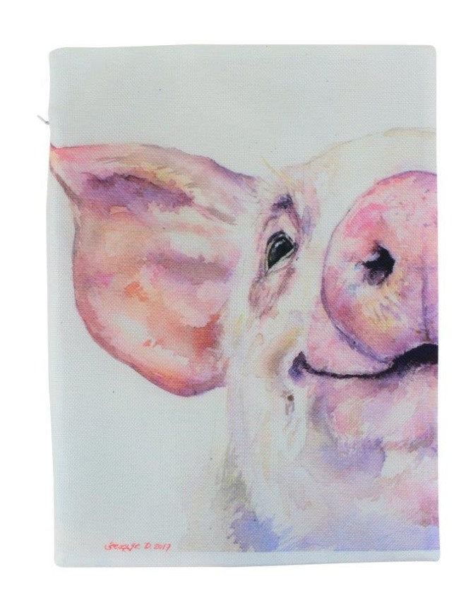 A charming 12x18 pillow cover featuring a watercolor illustration of a smiling pig, perfect for farmhouse decor.