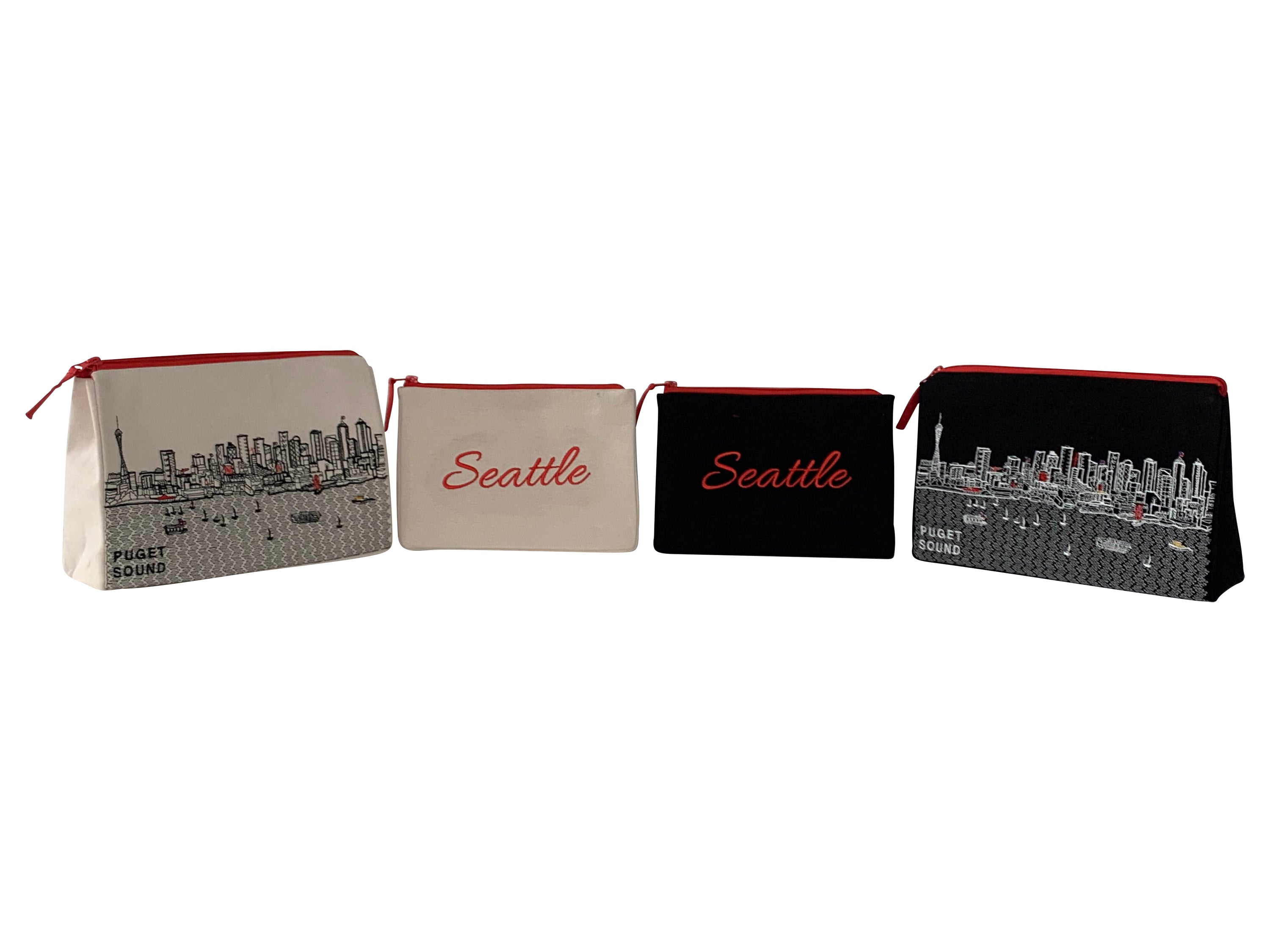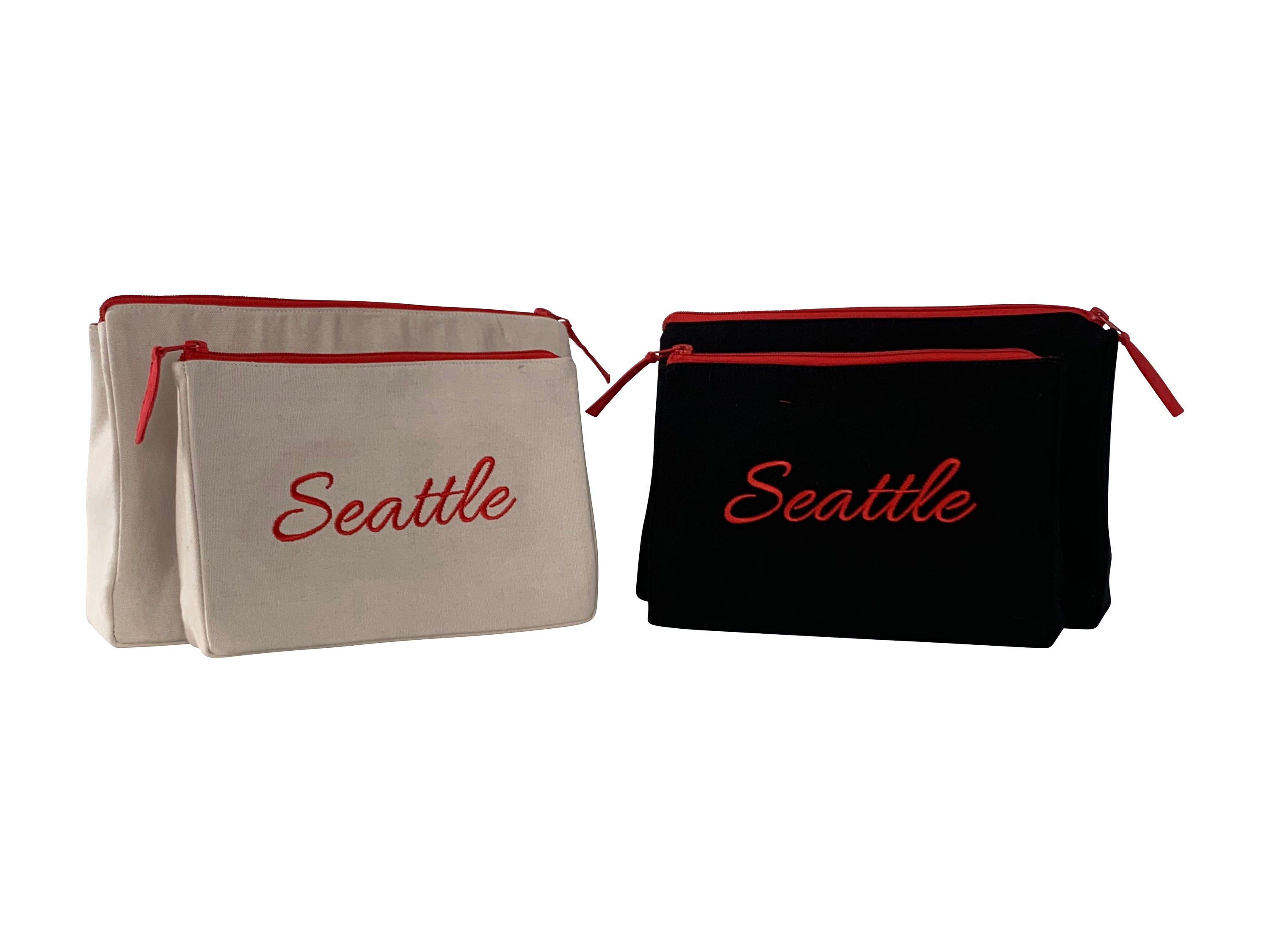 Introducing the Seattle Makeup Bag, a beautifully crafted set designed for those who appreciate style and functionality. Made from 100% cotton canvas, this makeup bag set features a stunning embroidered skyline of Seattle, making it not only a practical accessory but also a fashionable statement piece. Whether you're at home or on the go, this makeup bag set is perfect for organizing your beauty essentials.