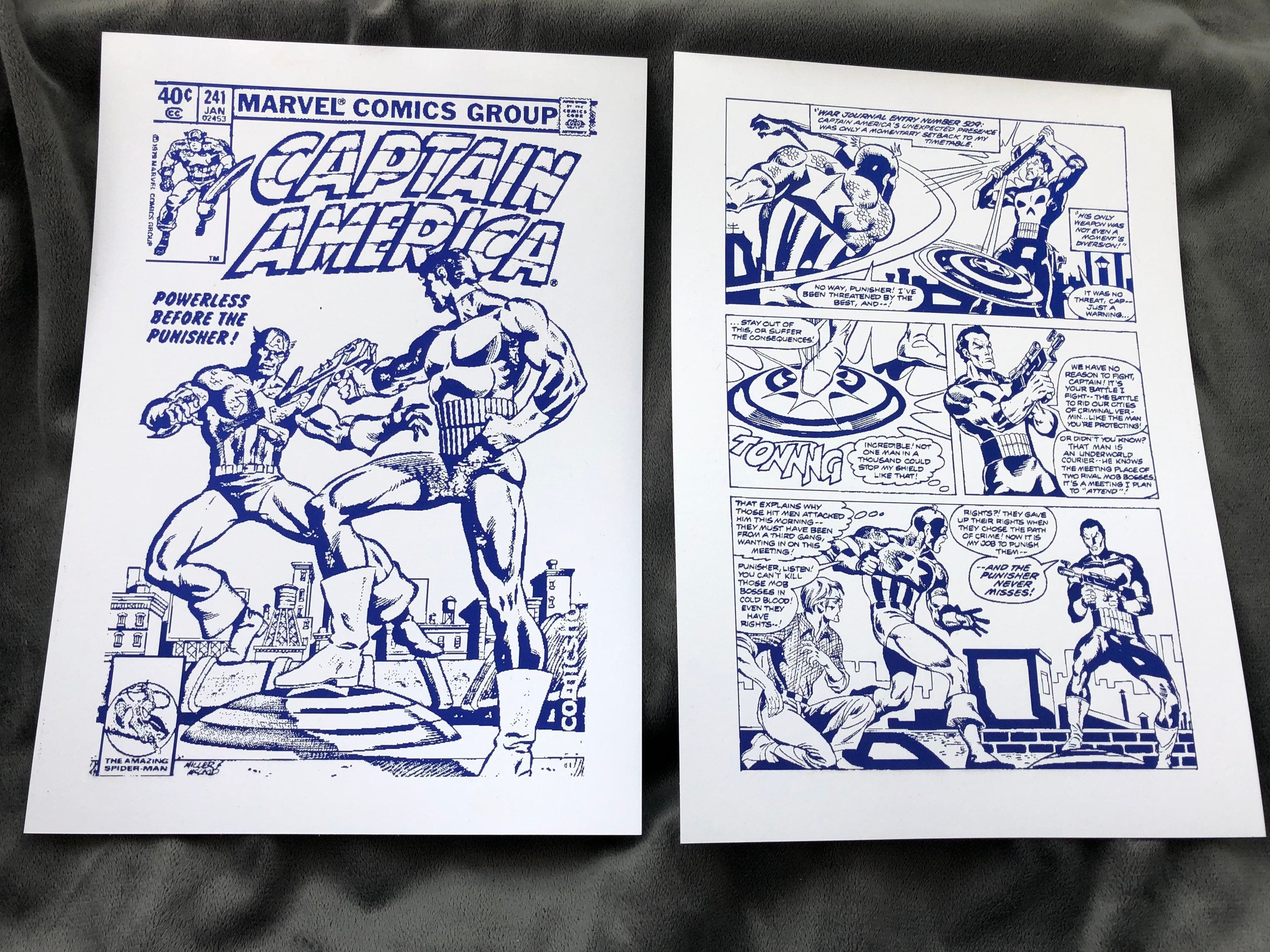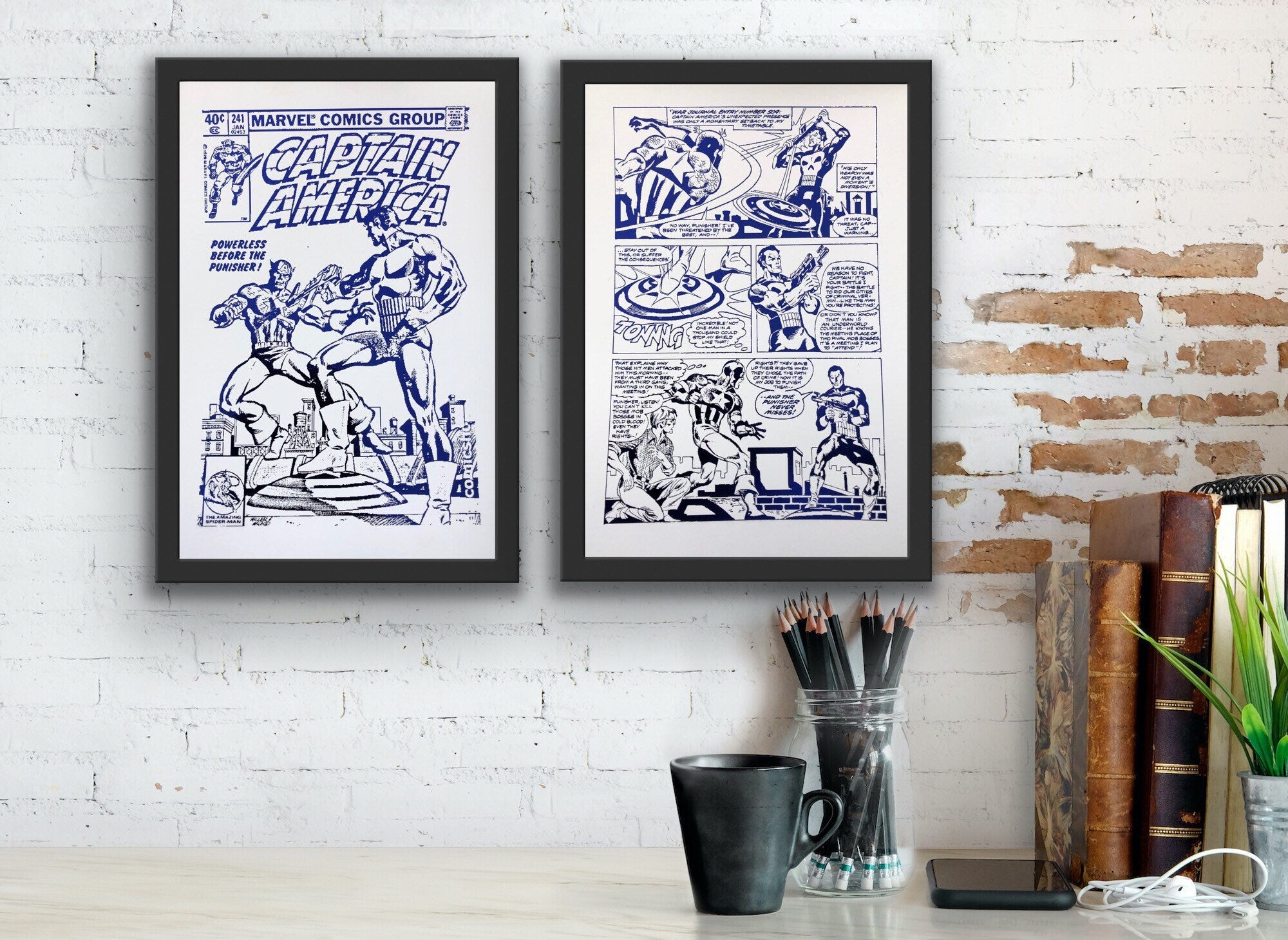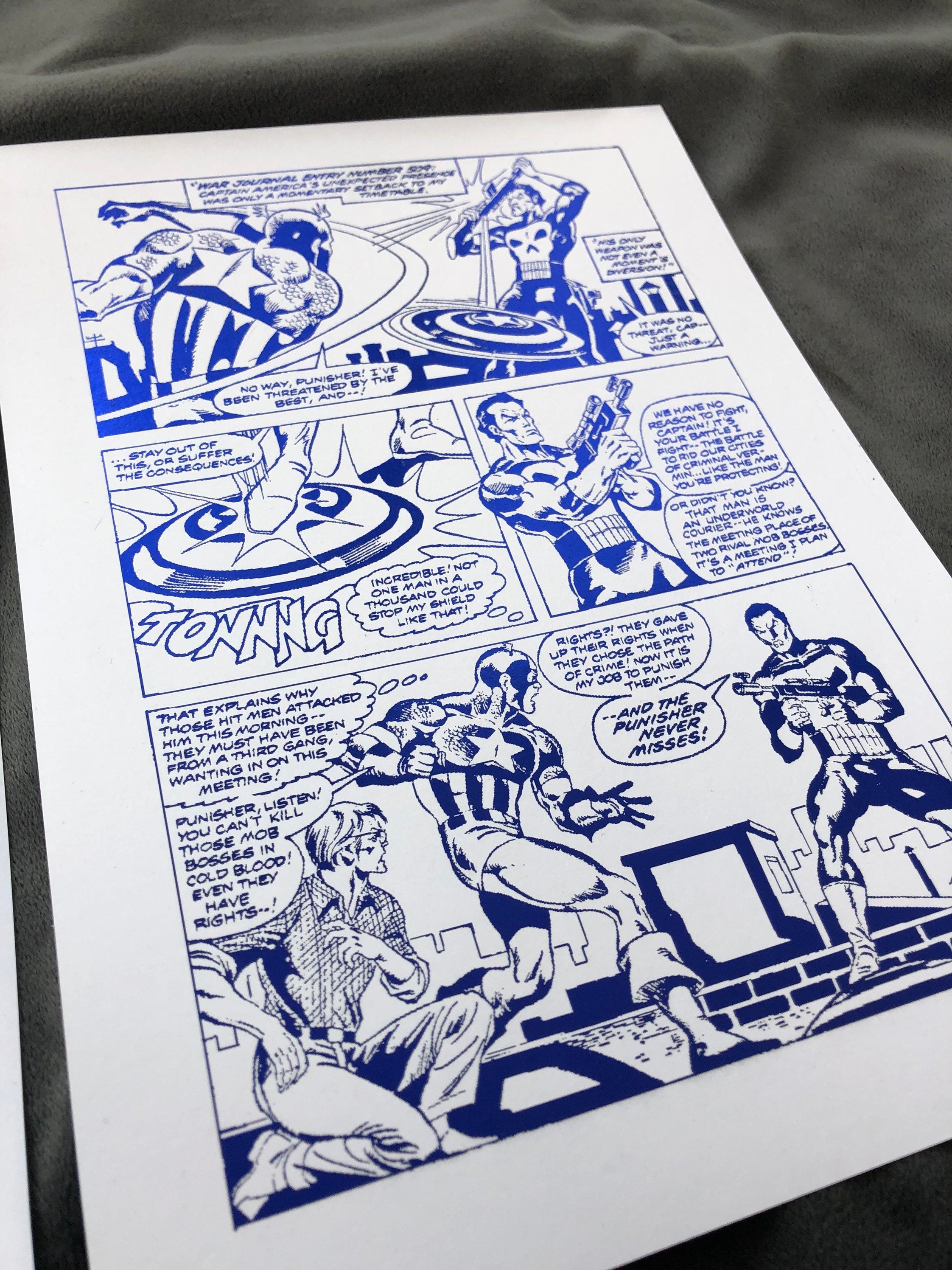 Set of 2 Captain America foil prints featuring vibrant comic cover and comic strip designs, showcasing the iconic superhero in a metallic finish.