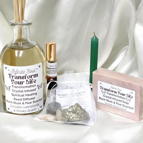 • Transformation Spiritual Healing Crystal Infused Intention Bar: Infused with the soothing scents of black musk and pear, this intention bar is perfect for setting your intentions and enhancing your meditation practices.
