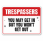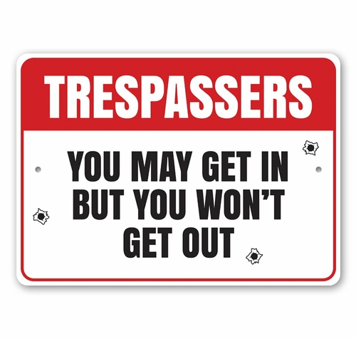 A decorative 2nd Amendment sign featuring the phrase 'Trespassers May Get In But Won't Get Out', made from high-quality aluminum.