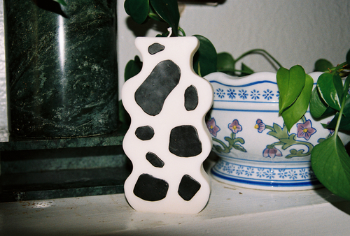 | Unscented soy wax pillar candles made without phthalates. The cow print pattern is created using black beeswax sheets. Small cutouts are gently melted onto the surface of a white candle. If for some reason a cutout falls off (or you want to rearrange the pattern!) you can simply warm the cutout in your hand and press it firmly back onto the surface. Uniquely handcrafted, these candles will look beautiful as they burn or as long-term decor. Each candle is poured, buffed, washed, and conditioned with care in my studio. Please burn on a heat-resistant surface, preferably with raised edges to catch melted wax. The Vase shape is tall and wavy. The candle will stay intact as the flame travels downward. 3.5” x 6” x 1.25”. |
