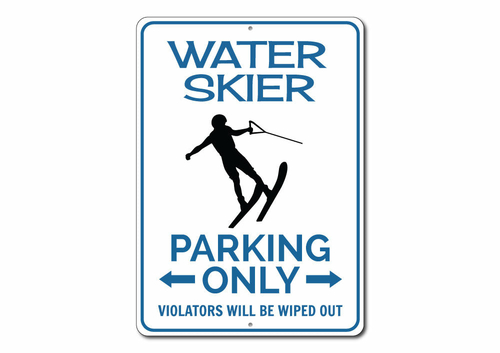 Introducing our Water Skier Parking Sign, a perfect solution for those who want to reserve a parking spot with style and creativity. This sign not only serves a practical purpose but also adds a touch of personality to your parking area. Whether you are a water skiing enthusiast or simply want to make a statement, this sign is designed to catch the eye and inform visitors of your reserved space.