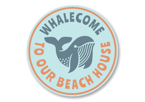 Whale Pun Beach House Sign featuring whimsical design and customizable text, made from durable aluminum.
