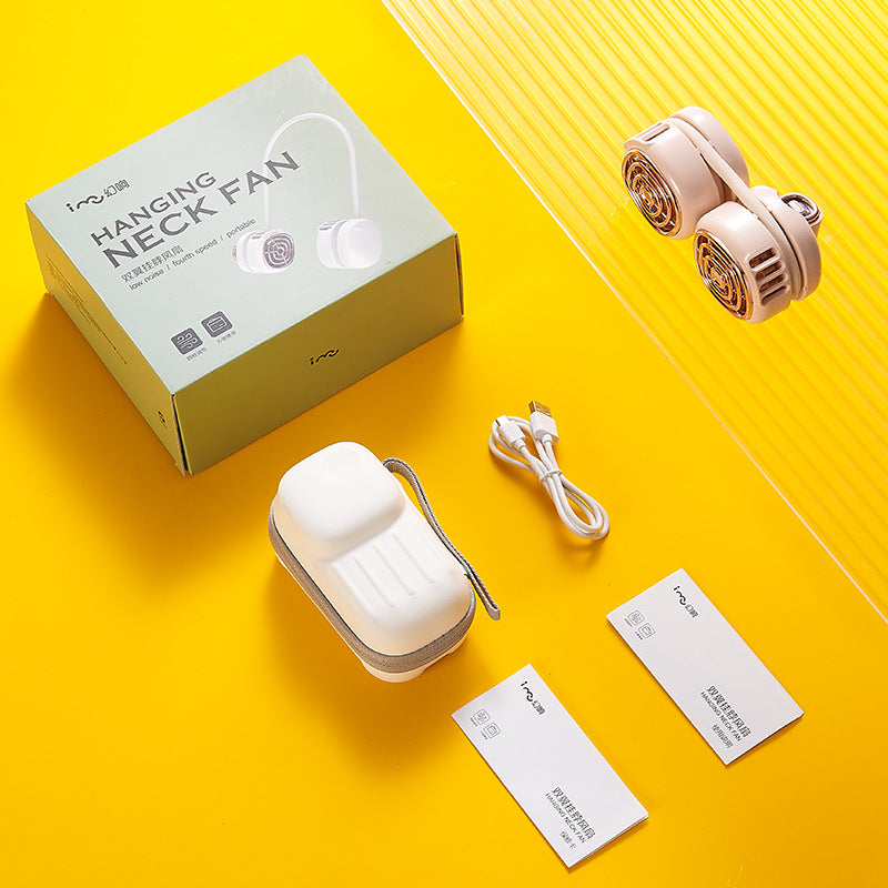 A portable Outdoor Travel Sports Electric Fan in pink color, featuring a hands-free headphone design and flexible hose for 360° rotation.