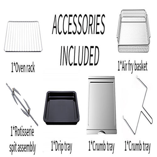 , rotisseries, fan speed, start/stop digital show tiime and temp, led display for different functions   Air fryer convection function circulates  air powerfully around food for fast, even cooking Auto programs:french fry, pizza, bread, cake, chicken, stick rotisseries,fish, dehydrate,warm."