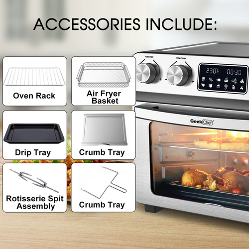 【Geekchef Convection Technology】6 different accessories and super convection technology are specially designed for quick and evenly cooking. 2 levels of convection speeds allow natural convection circulates air, provide a greater volume of air to ensure fast and even heat distribution.Which you will have the better flavor in your food.
