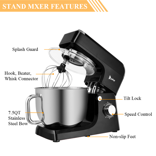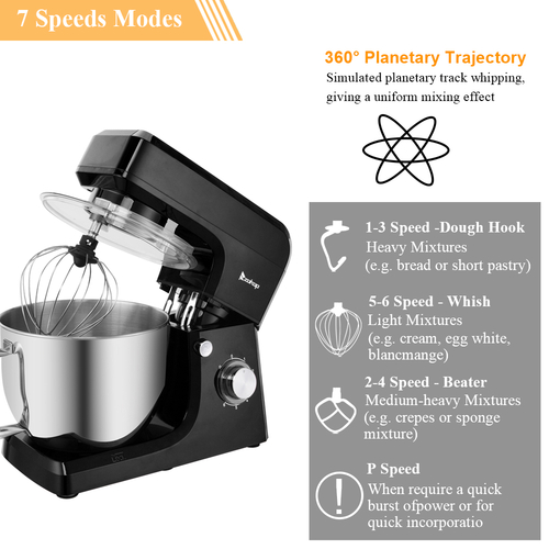 This high quality stand mixer is worth your choice. The mixer has 6 speed settings, allowing you to set the right speed for kneading dough or whipping cream. 660w high performance motor helps to save your time and energy. Non-slip feet keep the mixer still in using, and the splatter shield guards against messy drips, drops, and spills. This stand mixer is pro designed for your kitchen need. It will be one of your excellent kitchen appliance and gift choice.