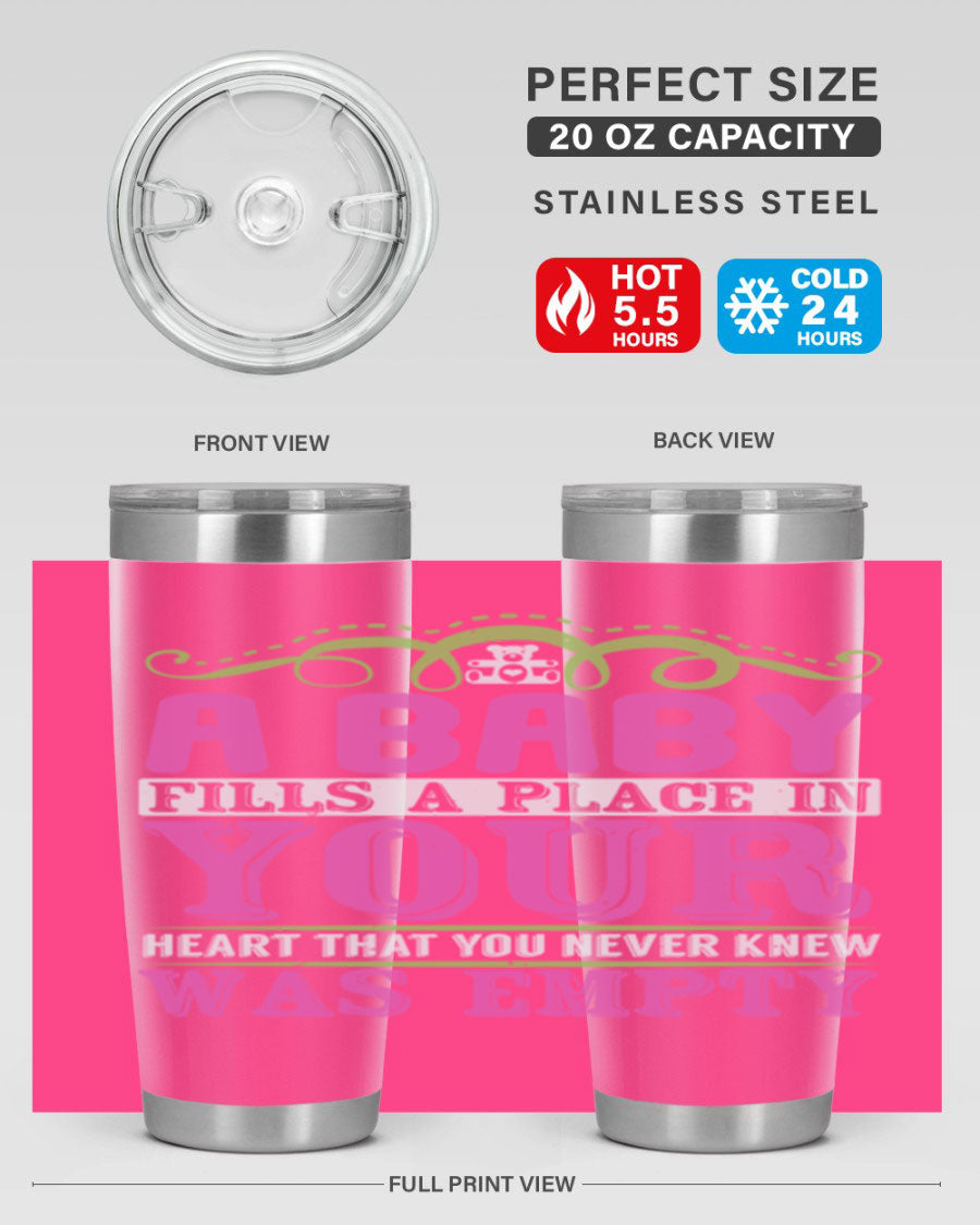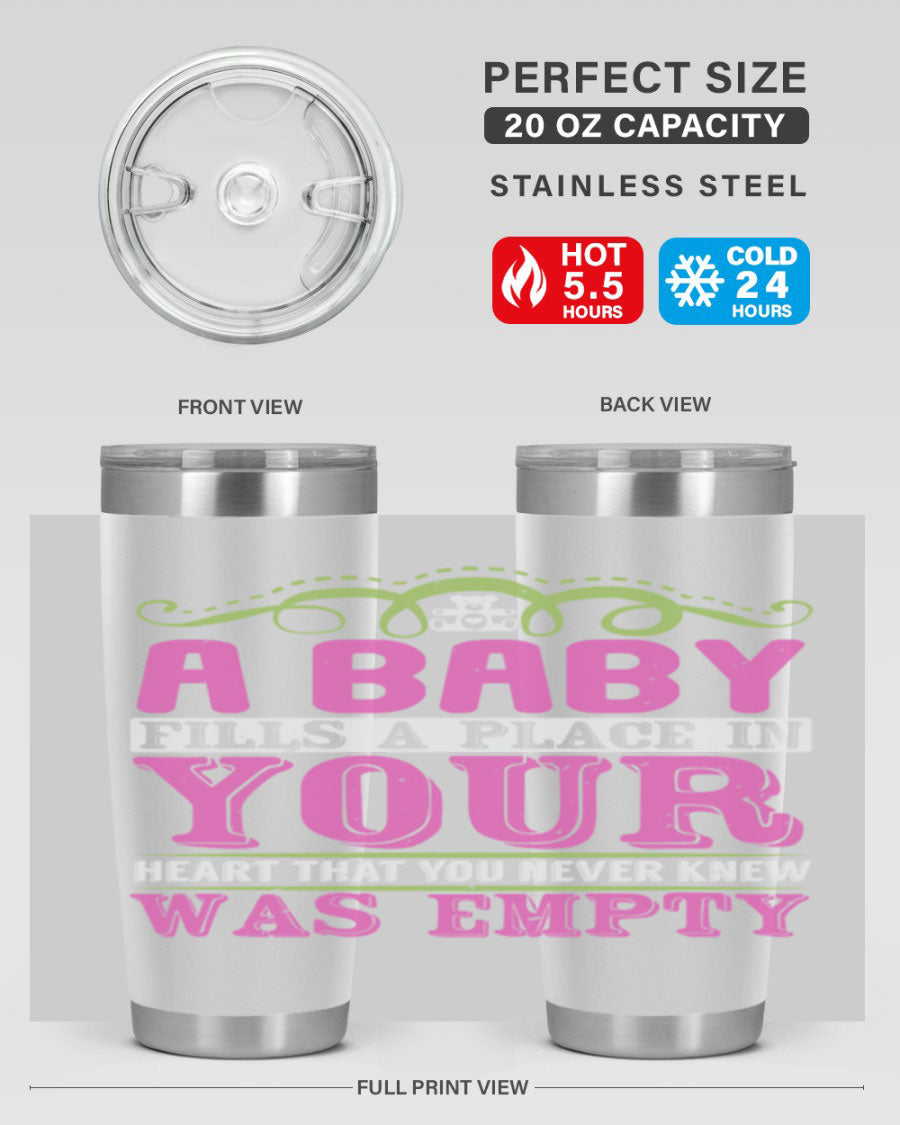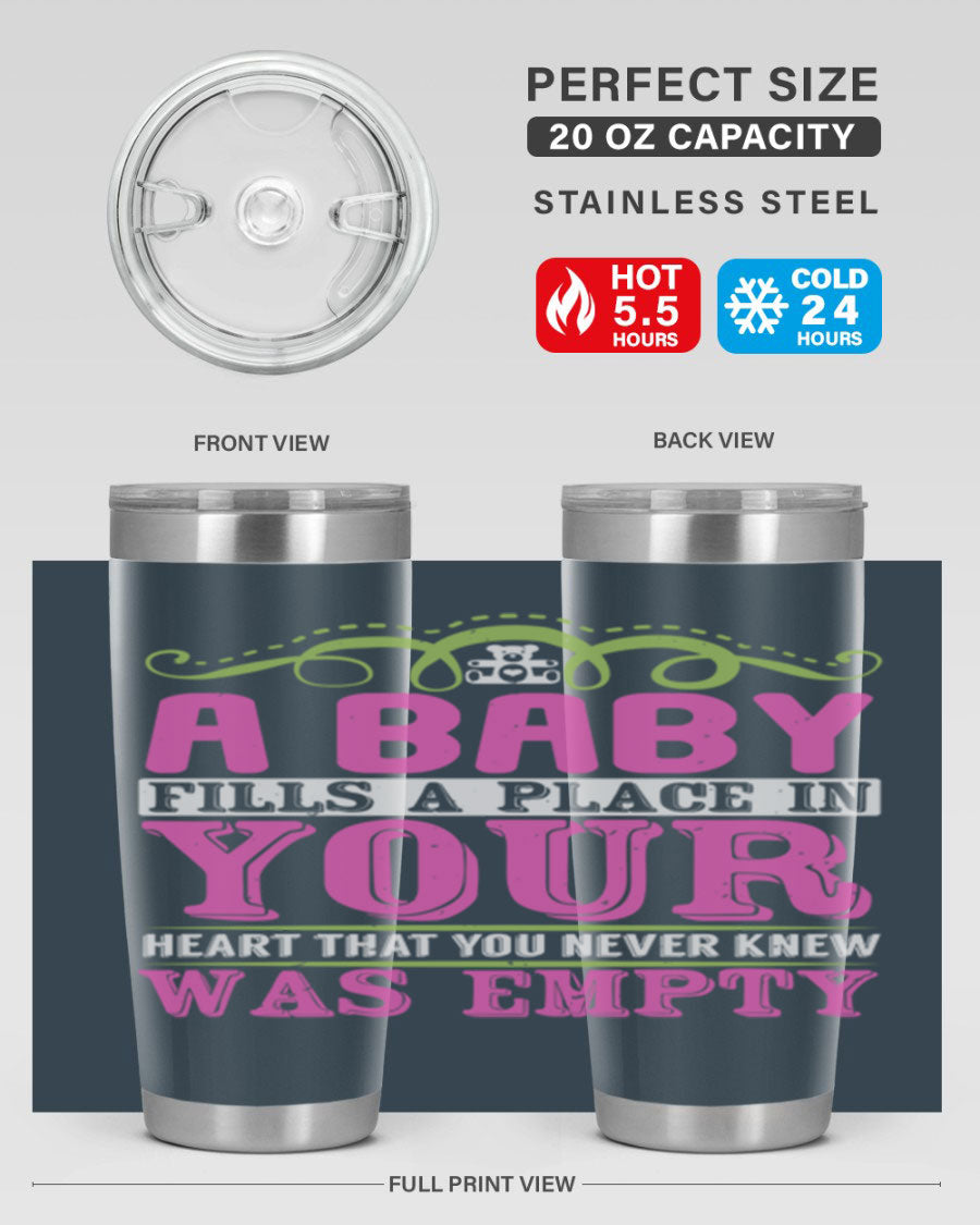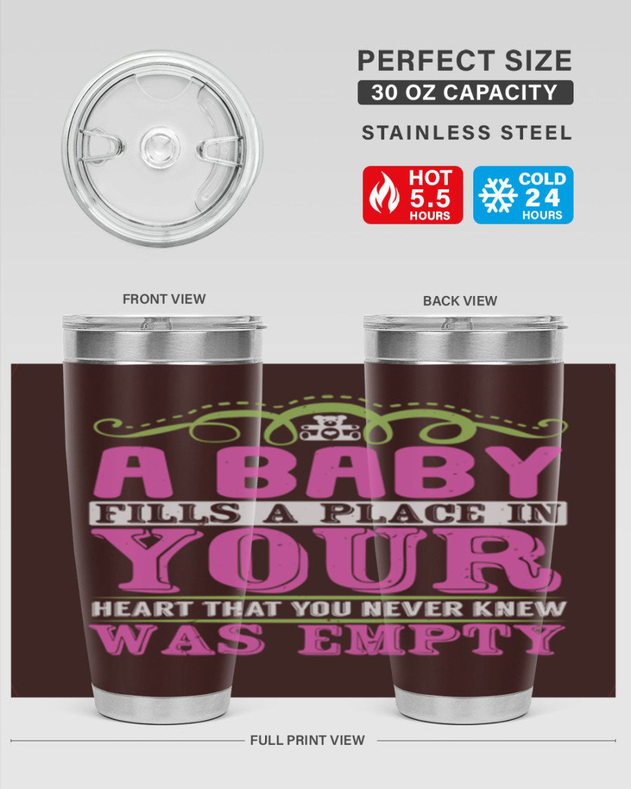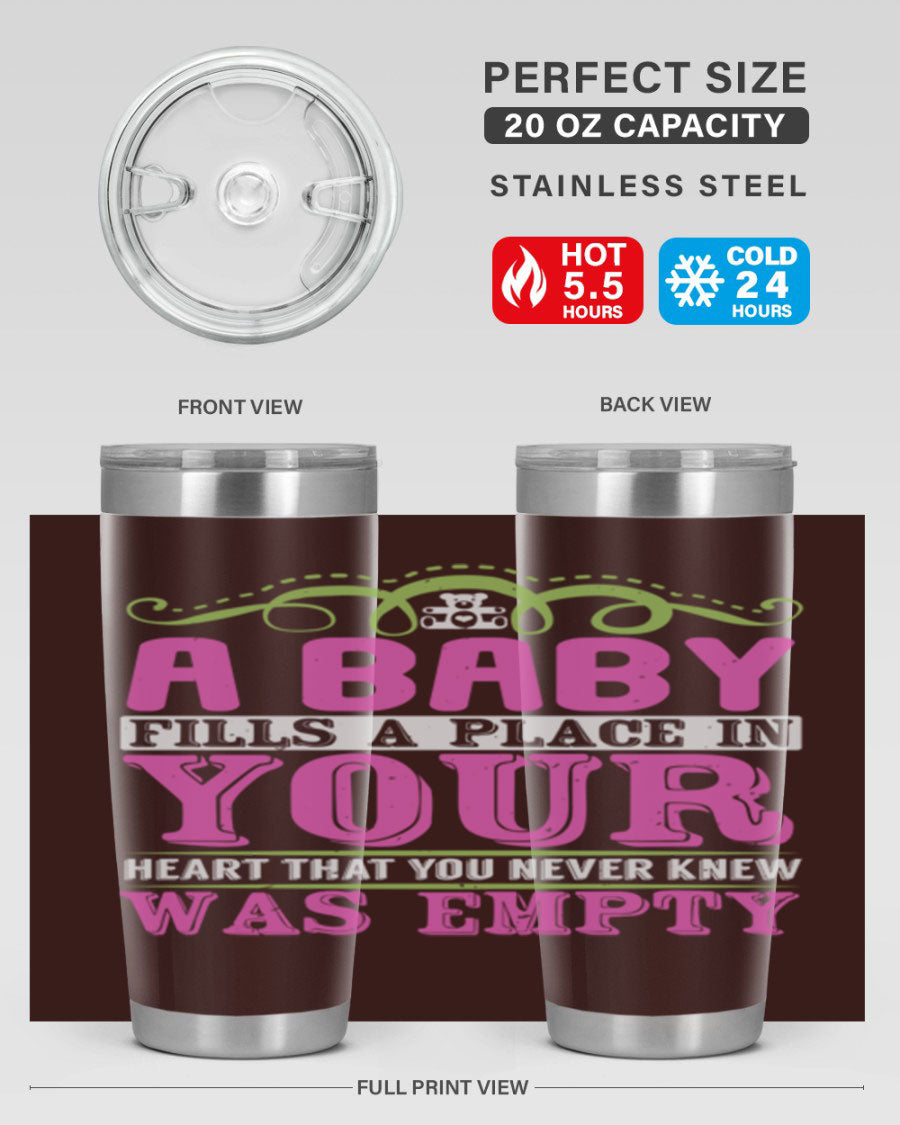 In summary, the 'A baby fills A place in Your Heart that you never knew was empty' tumbler is more than just a drinkware item; it's a celebration of love and joy that comes with parenthood. With its excellent insulation, convenient design, and heartfelt message, it’s a must-have for anyone who values quality and sentiment in their everyday items.