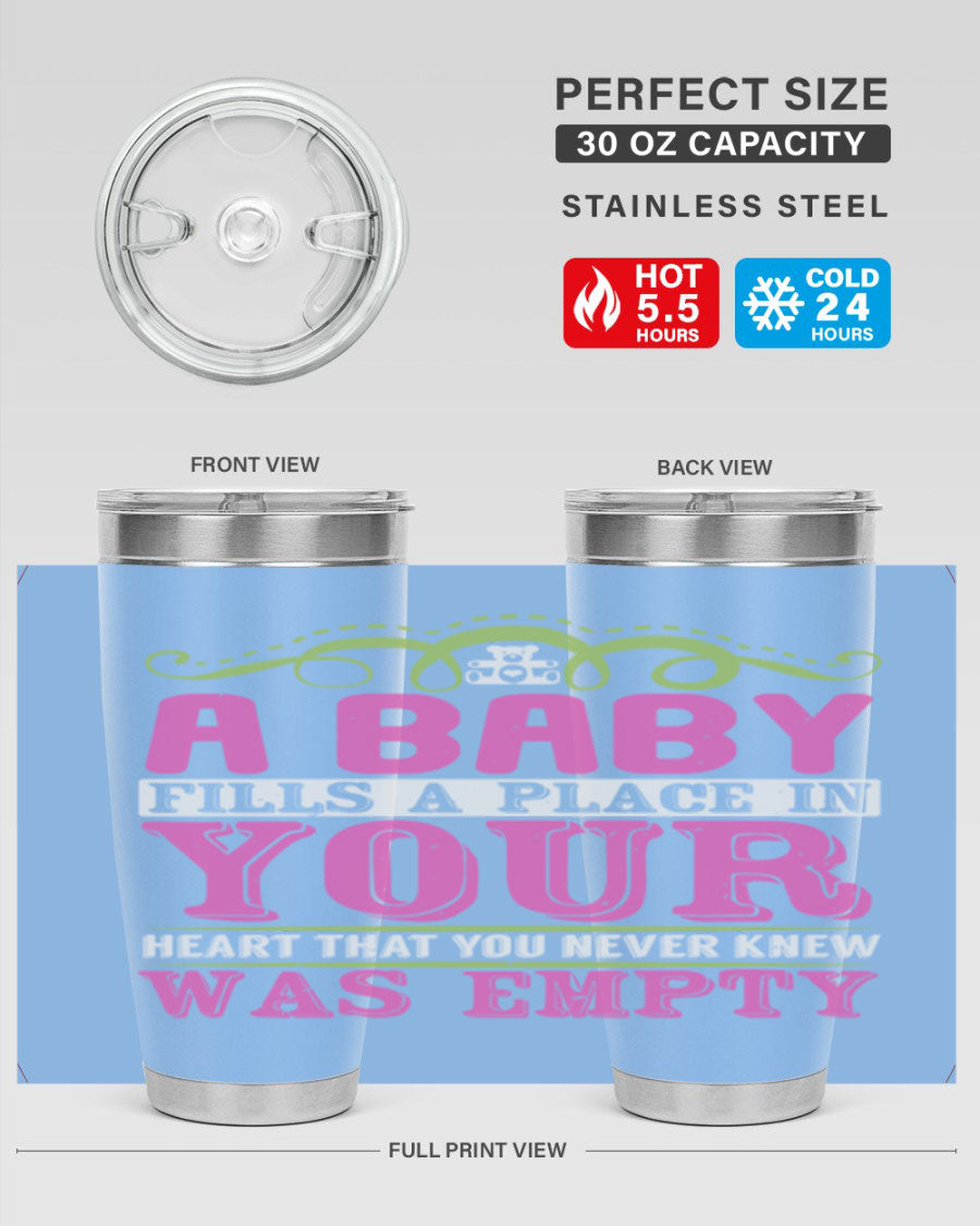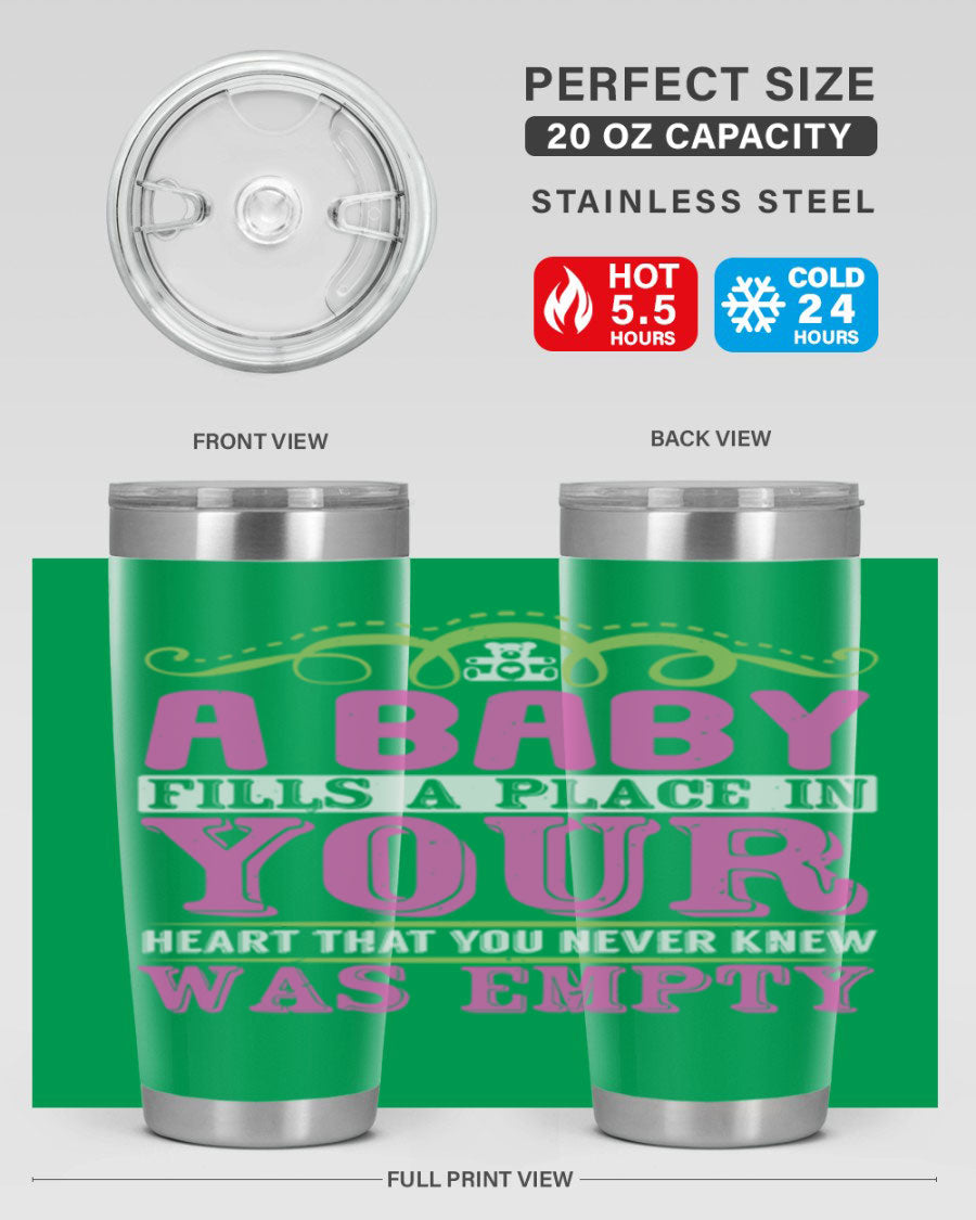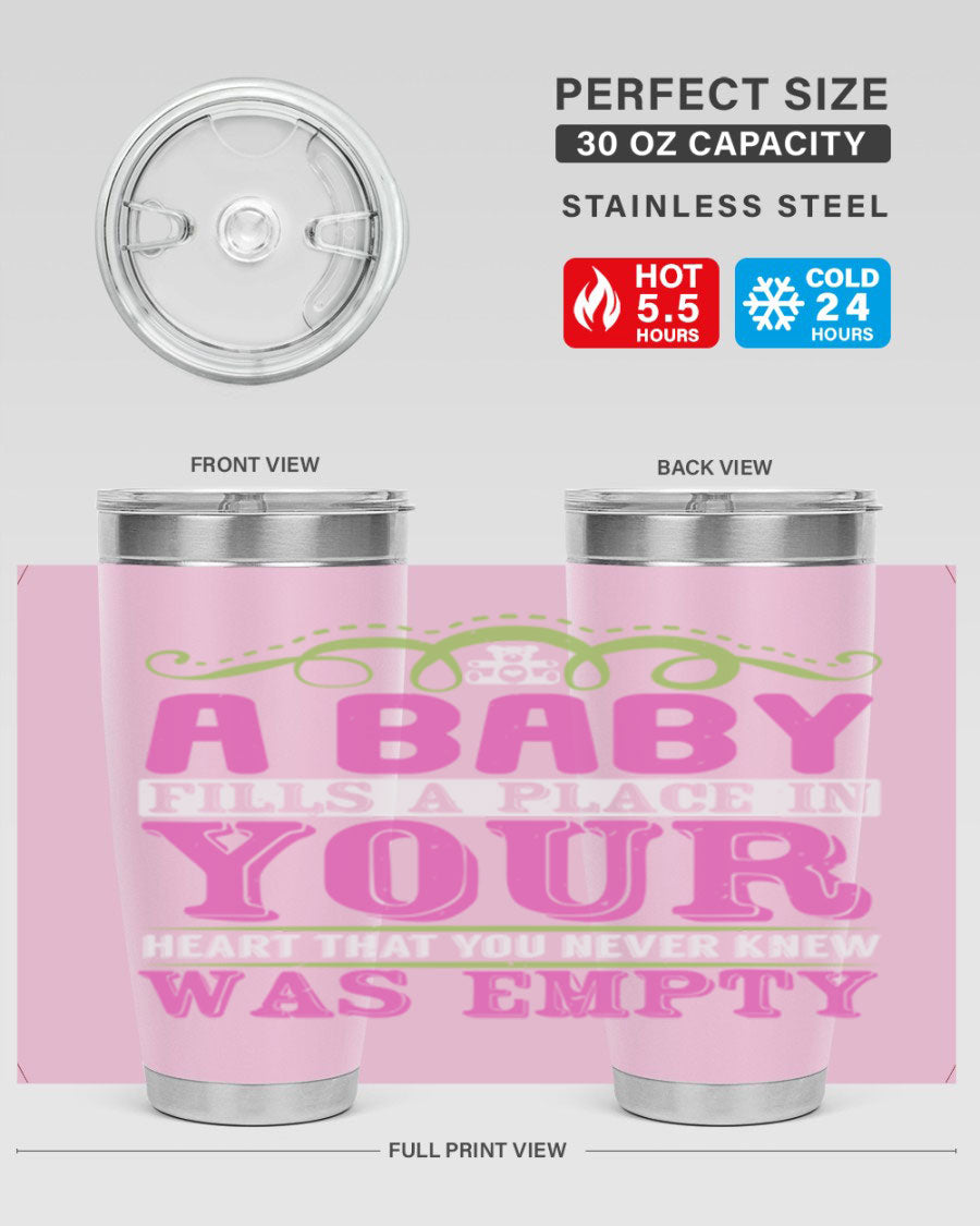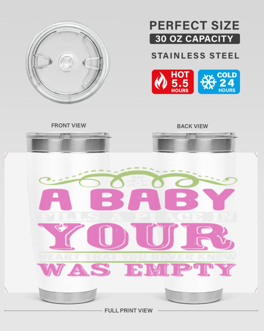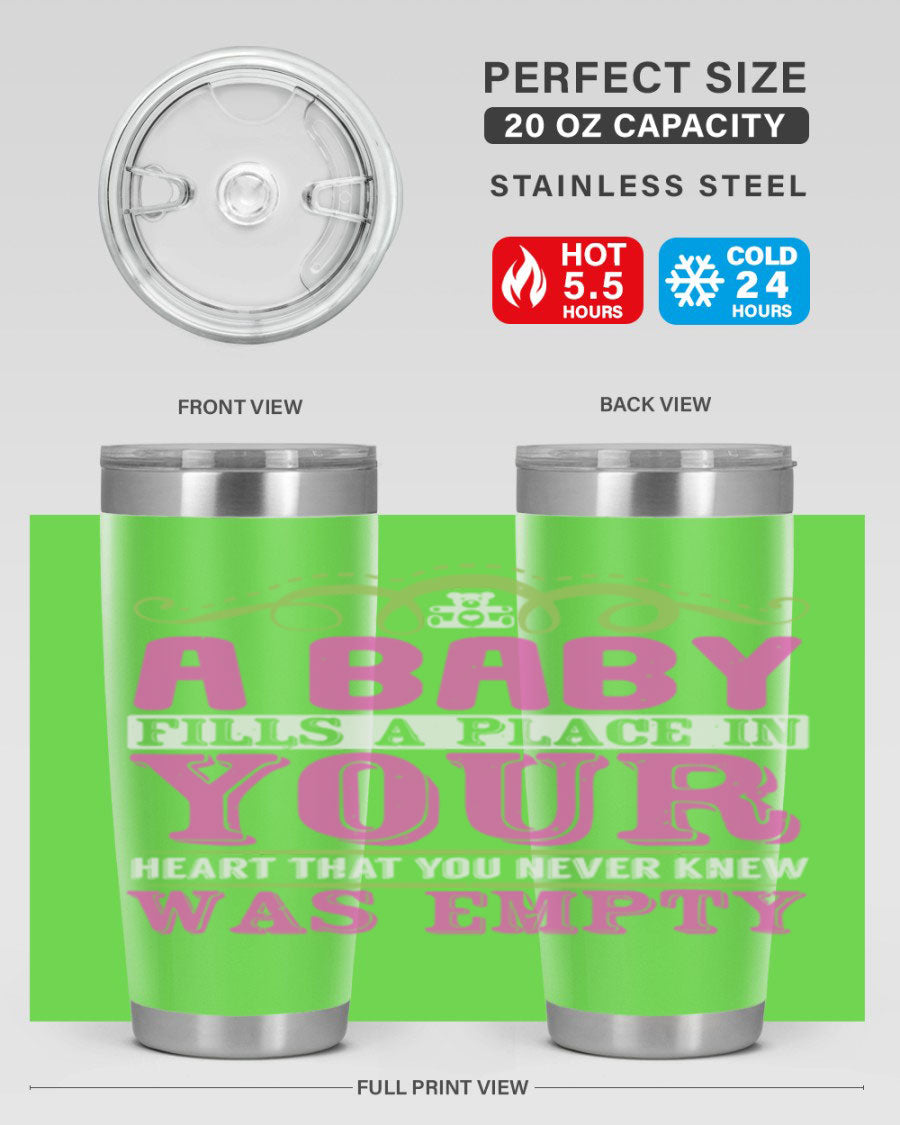 In summary, the 'A baby fills A place in Your Heart that you never knew was empty' tumbler is more than just a drinkware item; it's a celebration of love and joy that comes with parenthood. With its excellent insulation, convenient design, and heartfelt message, it’s a must-have for anyone who values quality and sentiment in their everyday items.