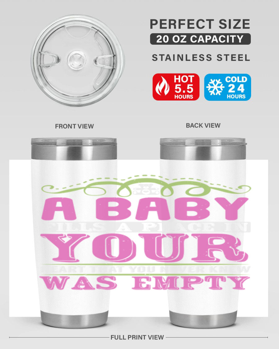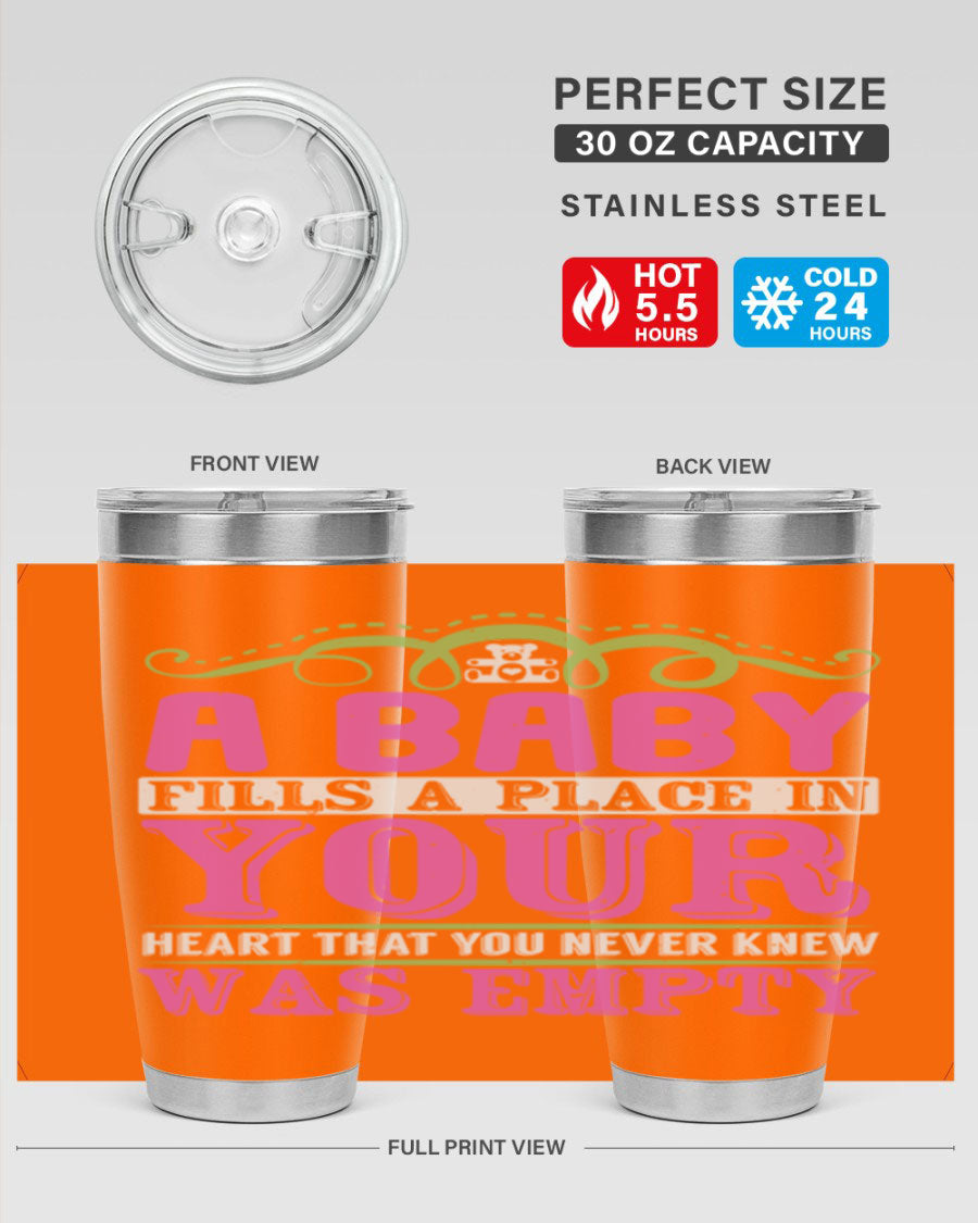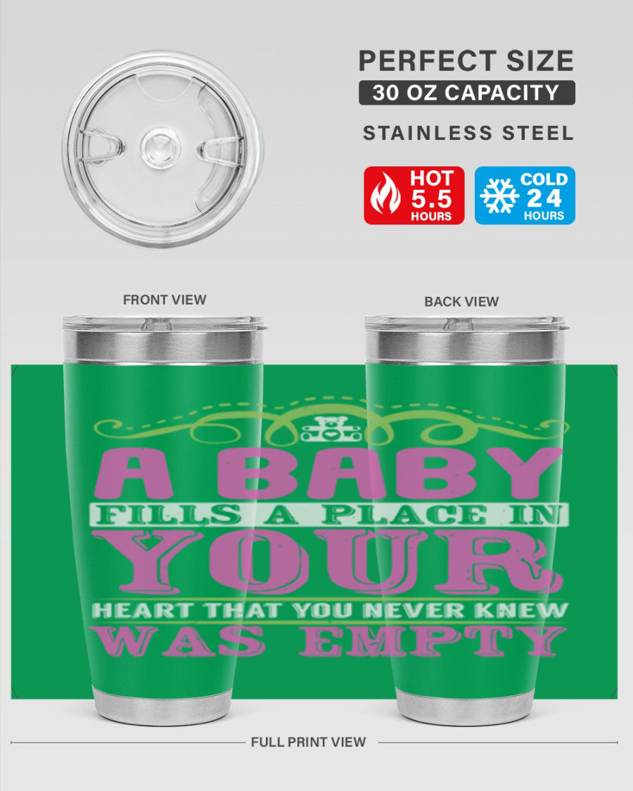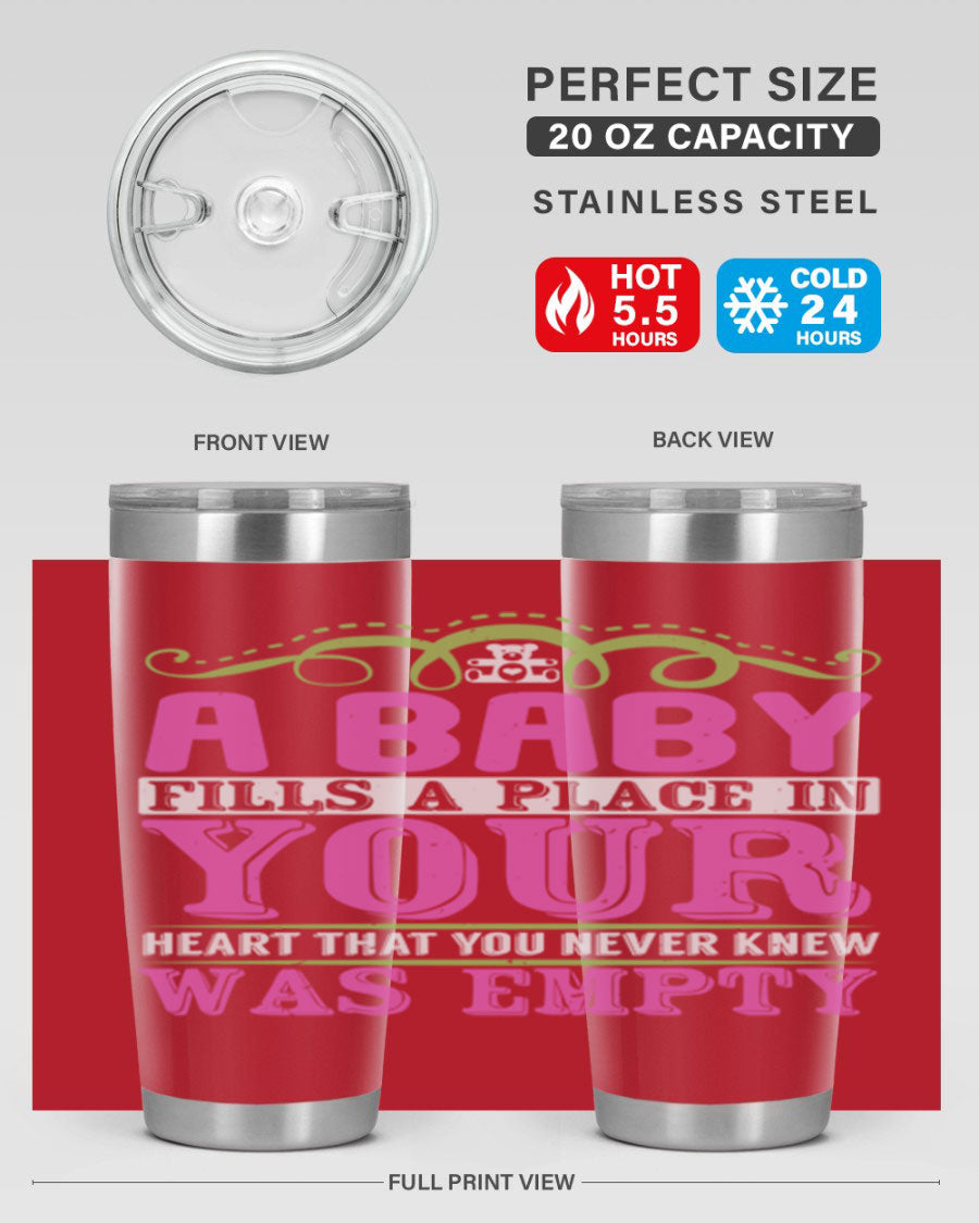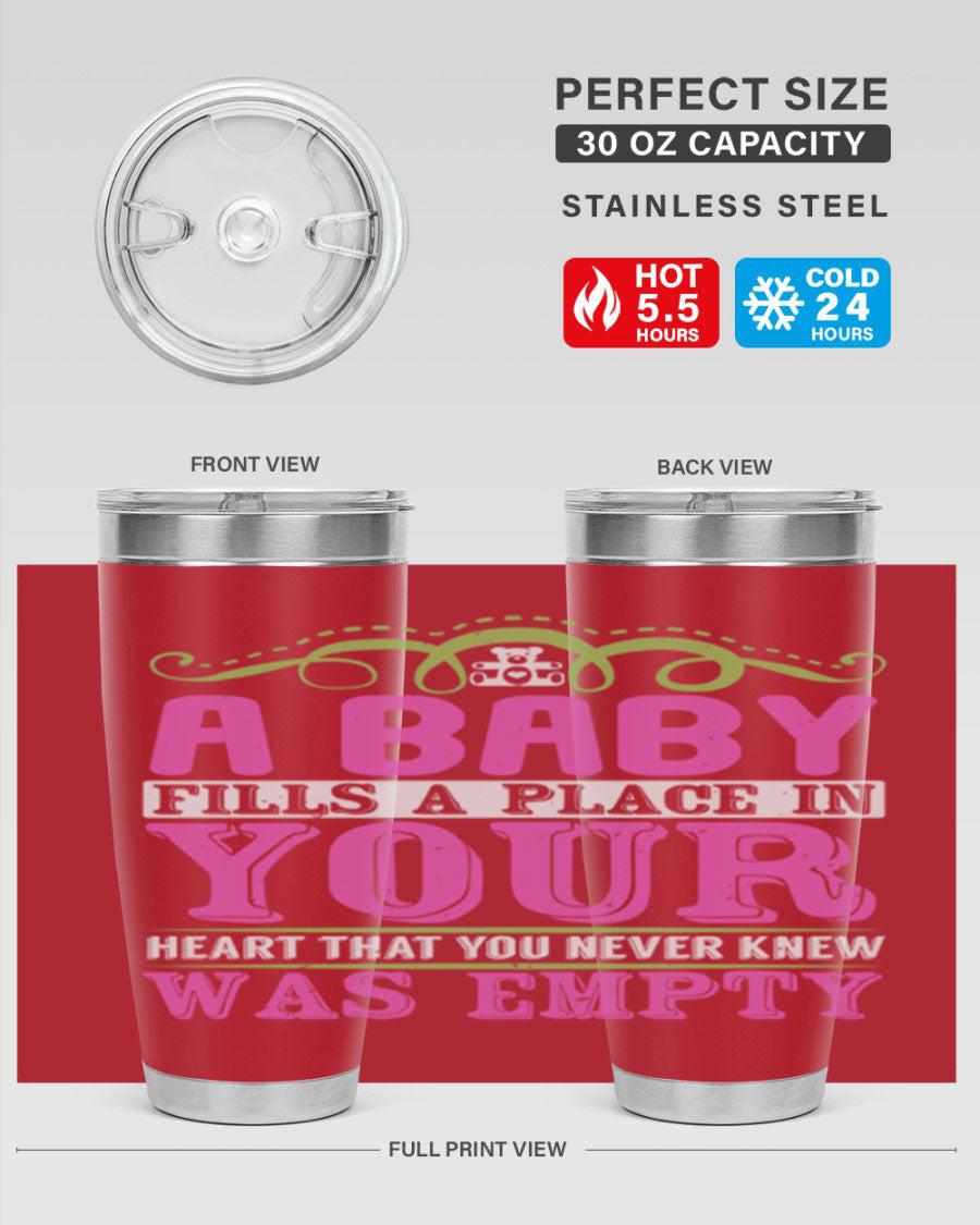 In summary, the 'A baby fills A place in Your Heart that you never knew was empty' tumbler is more than just a drinkware item; it's a celebration of love and joy that comes with parenthood. With its excellent insulation, convenient design, and heartfelt message, it’s a must-have for anyone who values quality and sentiment in their everyday items.