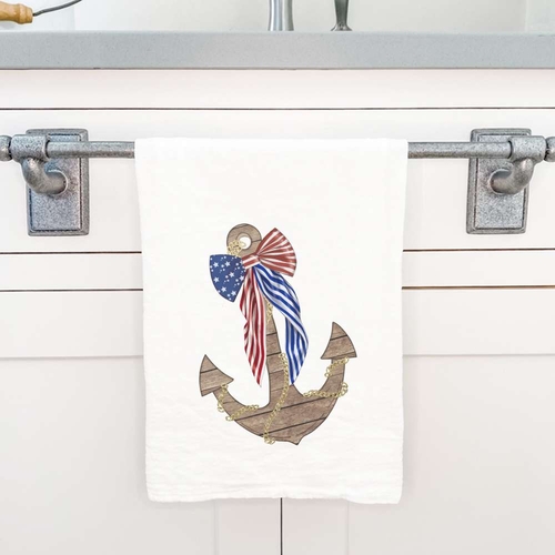 All photos and designs are (C) 2023, American Life Brands. Elevate your kitchen experience with our Anchor with Flag Bow cotton tea towel today!