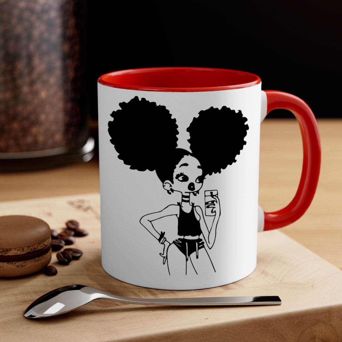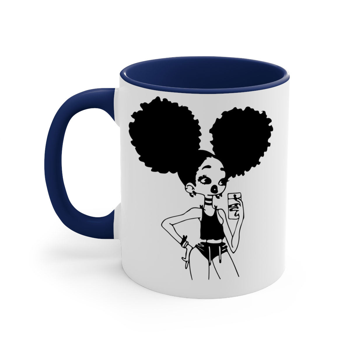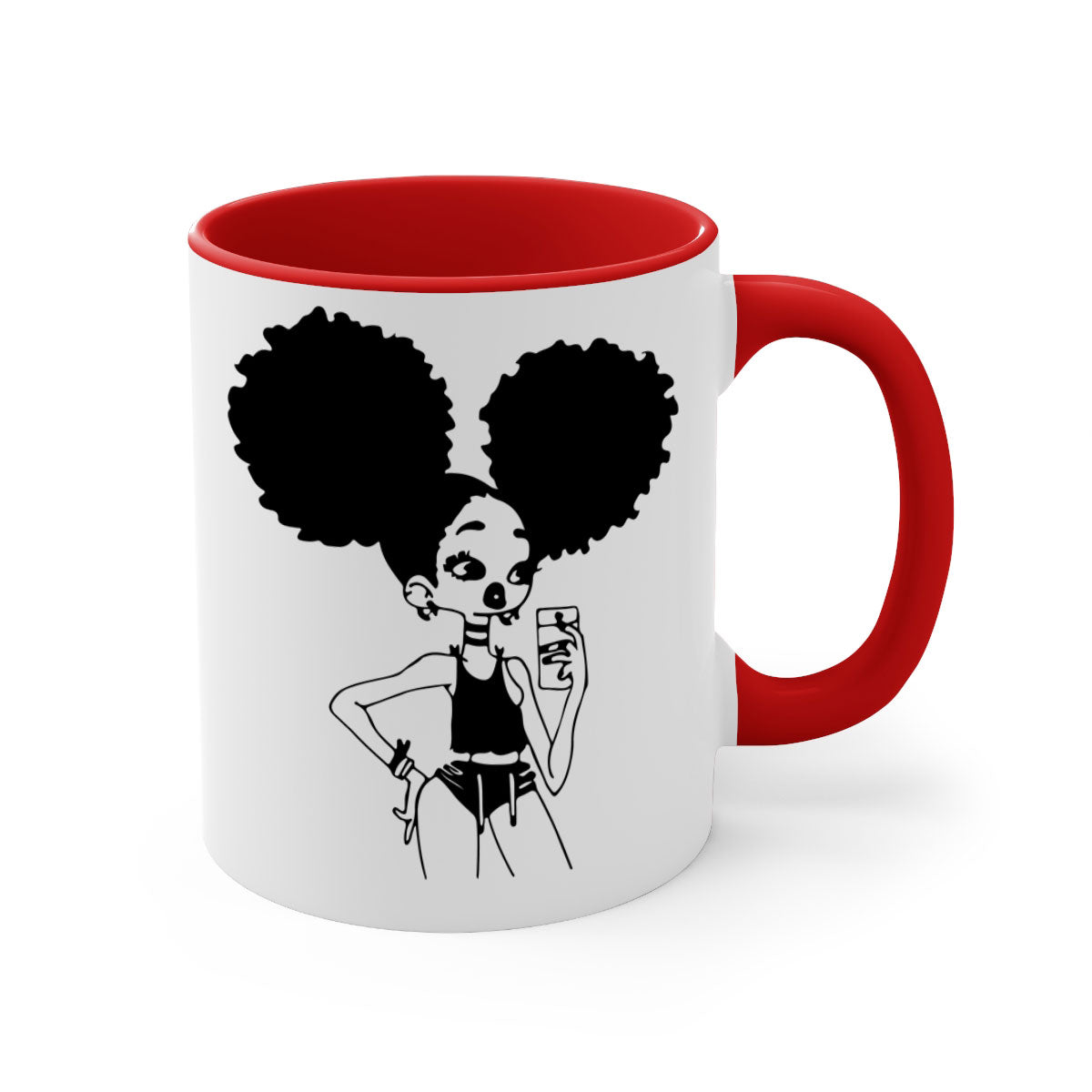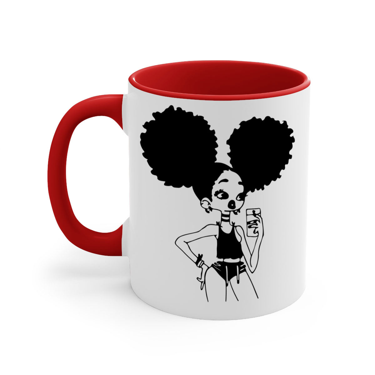 The Black Girl Taking Mirror Selfie Mug features a stylish two-tone design that is both eye-catching and functional. With a glossy finish and a colored handle, this mug is not just a drinkware item; it's a statement piece. Available in five vibrant colors, you can choose the one that best complements your style or mood. The glossy finish adds a touch of elegance, making it a great addition to any kitchen or office.