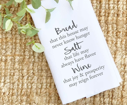 The Bread, Salt, Wine cotton tea towel makes for a thoughtful gift for housewarmings, weddings, or any special occasion. Its unique design and practical use will surely be appreciated by anyone who loves to cook or entertain. Pair it with a bottle of wine or a loaf of artisanal bread for a delightful gift set.