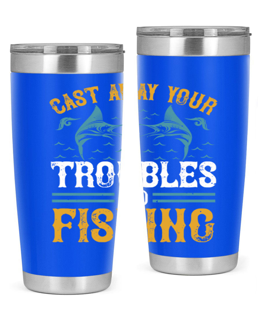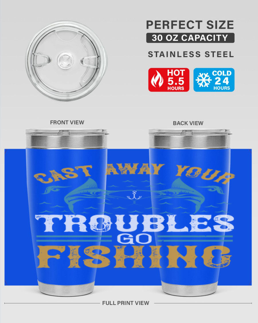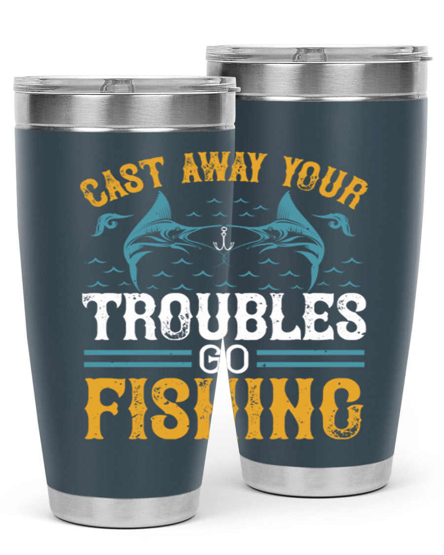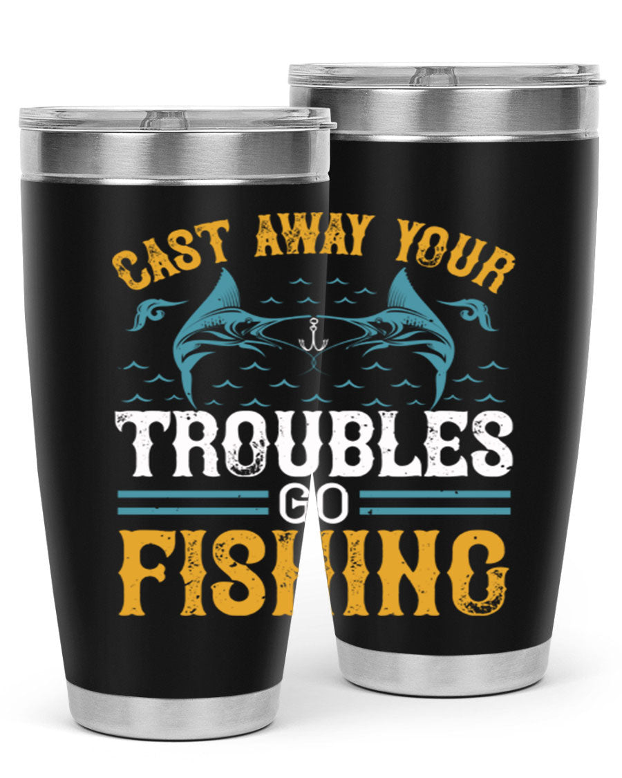 Cast Way Your Troubles Go Fishing 20oz and 30oz Tumblers made of stainless steel with a fishing theme design.