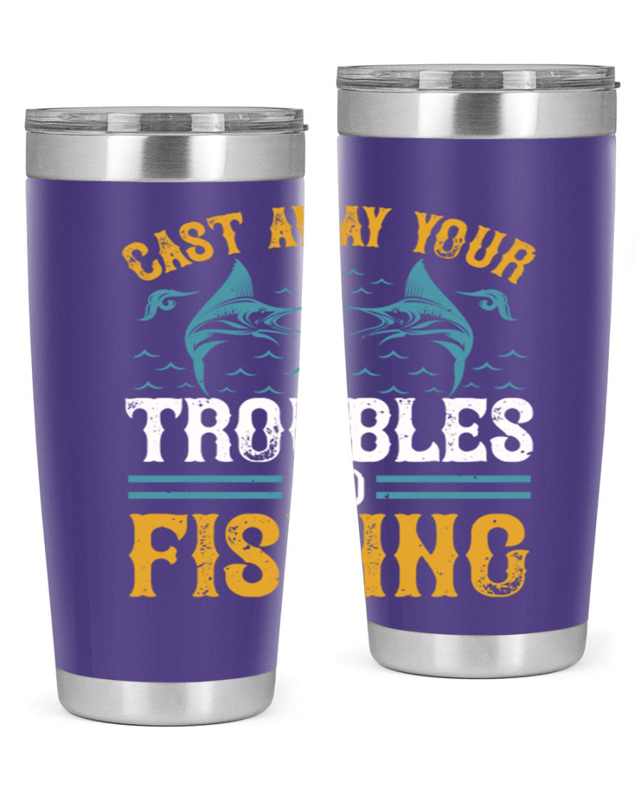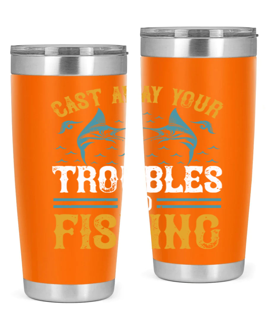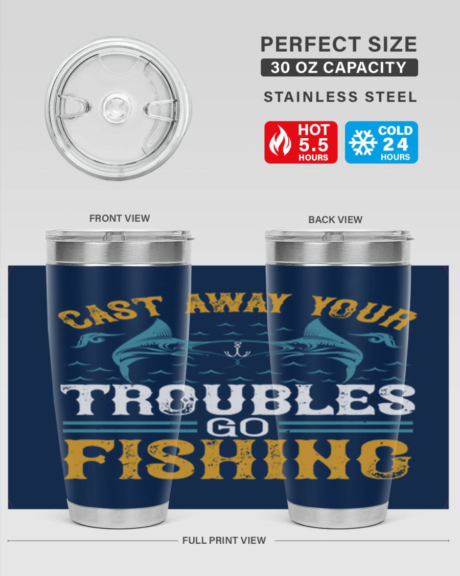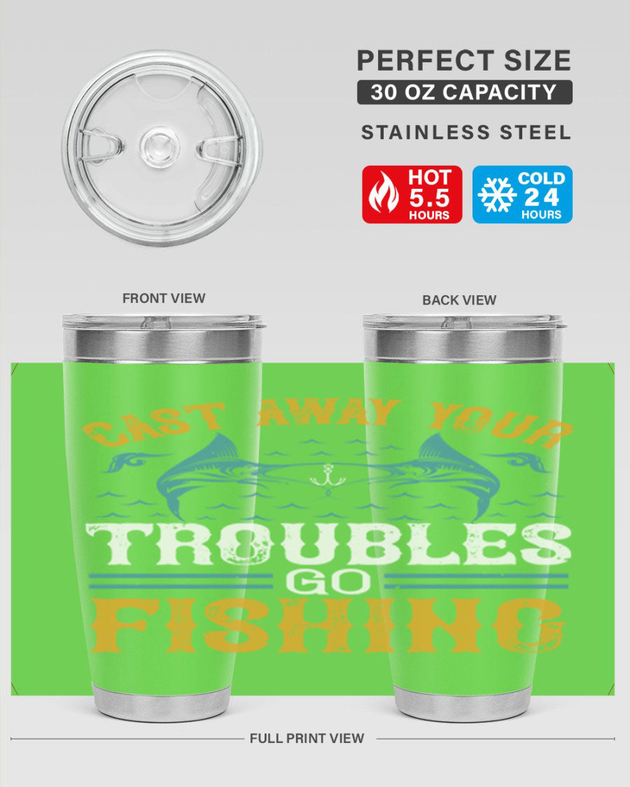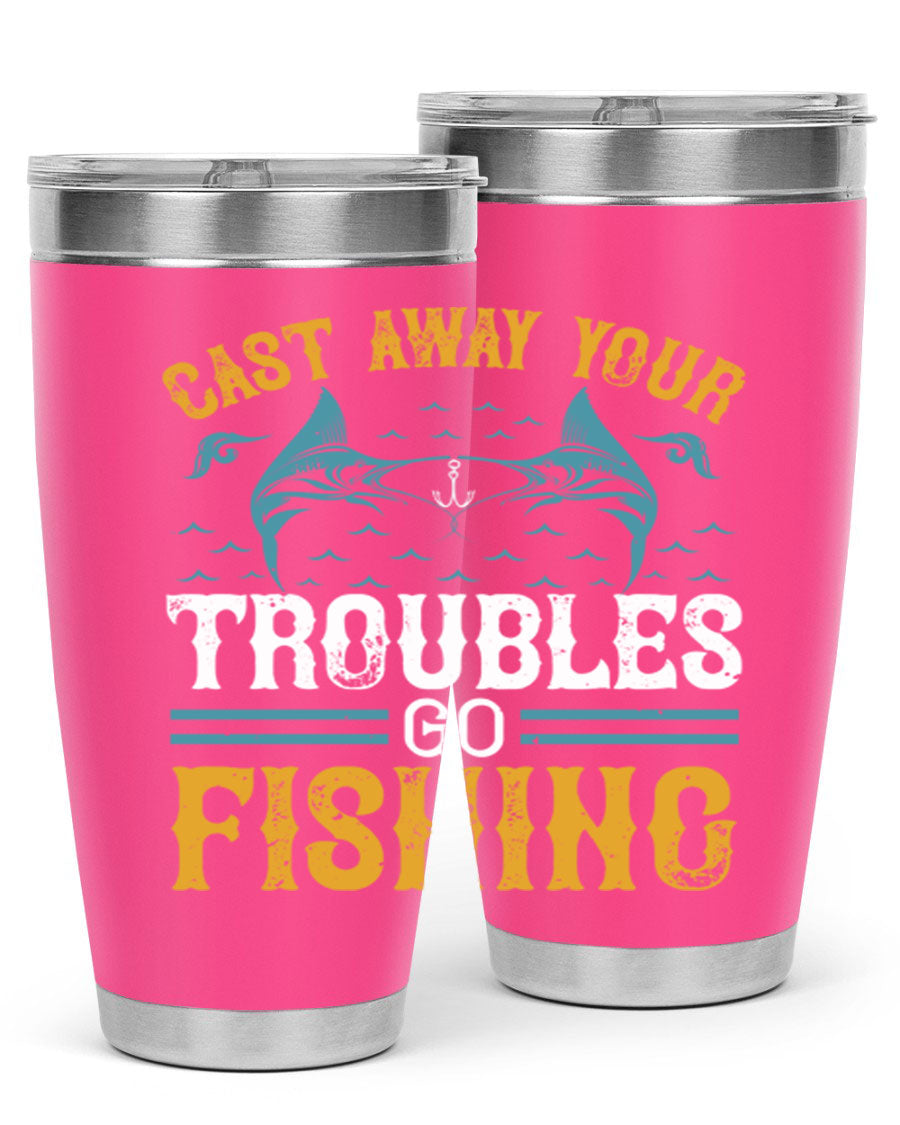 Cast Way Your Troubles Go Fishing 20oz and 30oz Tumblers made of stainless steel with a fishing theme design.