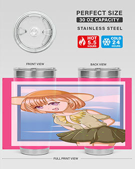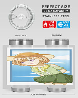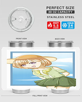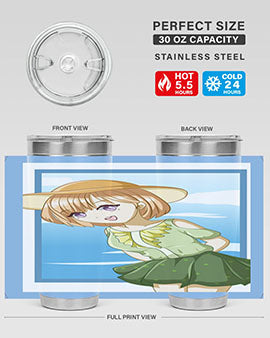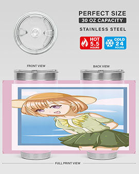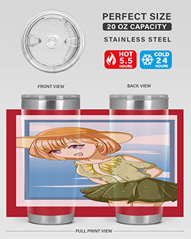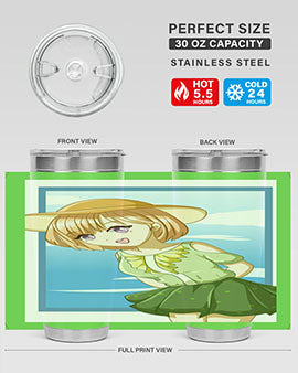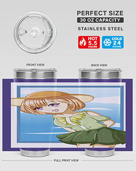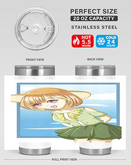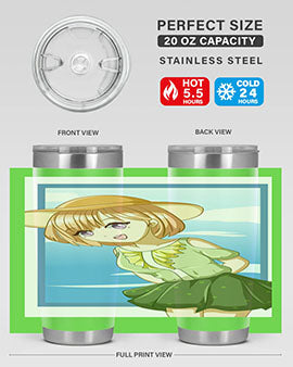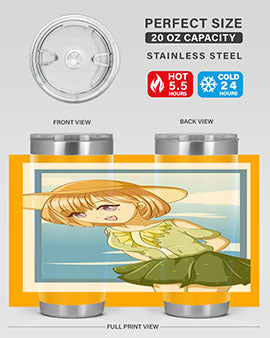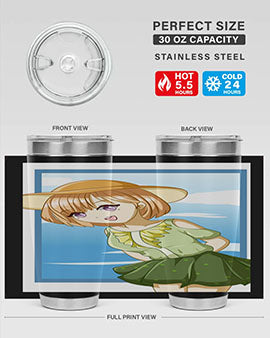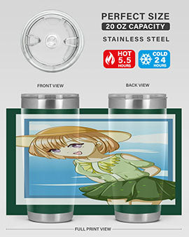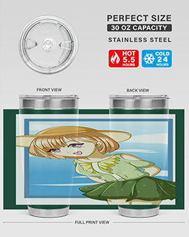 In summary, our tumbler featuring a cute and beautiful girl with brown hair in a green dress is the perfect accessory for summer. With its high-quality materials, impressive temperature retention, and convenient design, it is an essential item for anyone who enjoys beverages on the go. Order yours today and add a touch of summer charm to your drinkware collection!