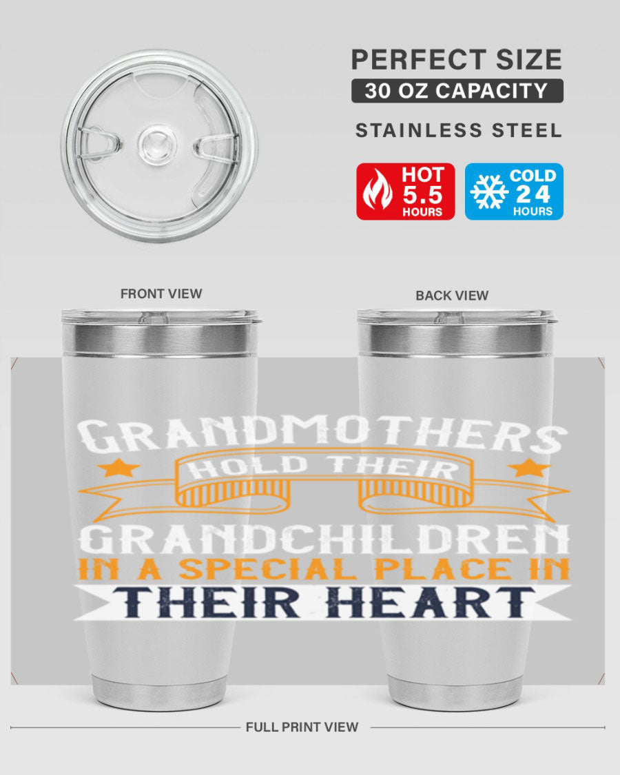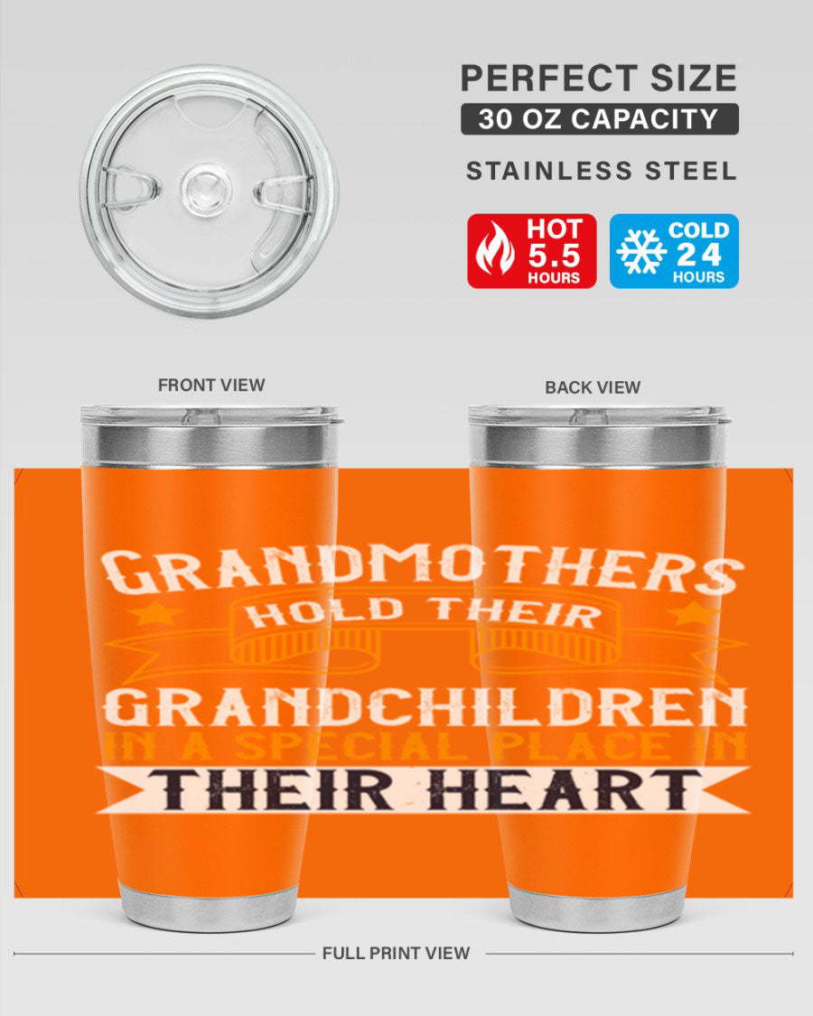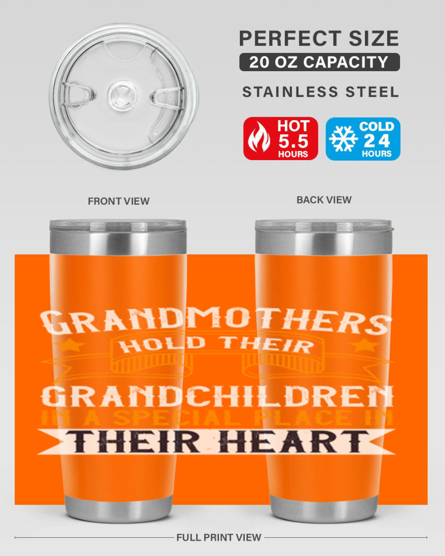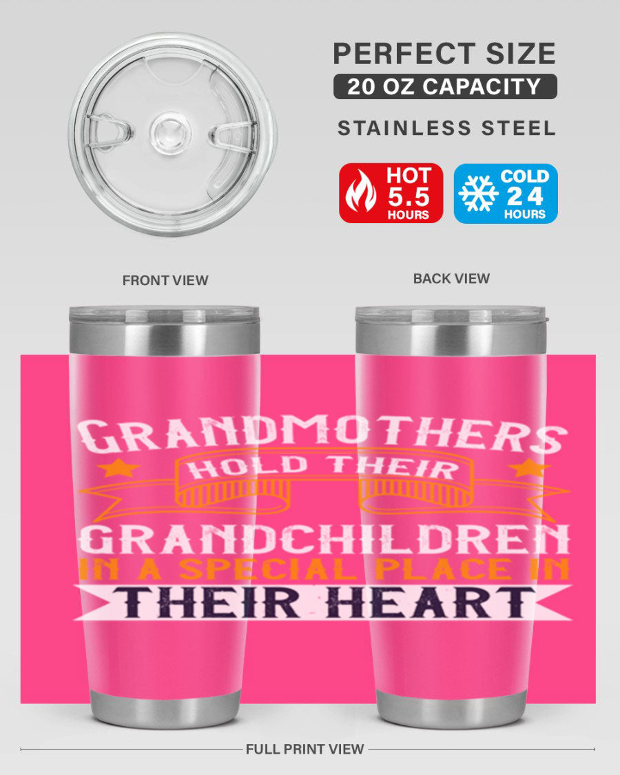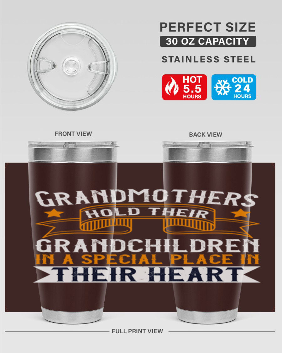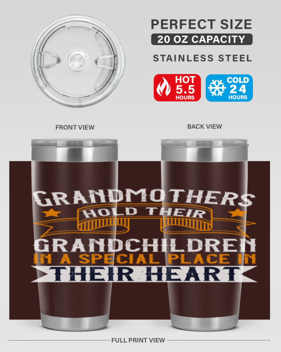 A beautifully designed stainless steel tumbler featuring a heartfelt message about grandmothers and their grandchildren, showcasing its double wall vacuum insulation.