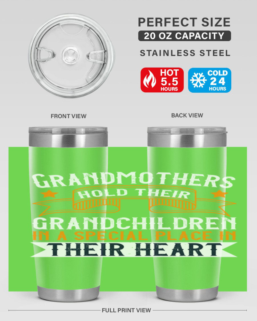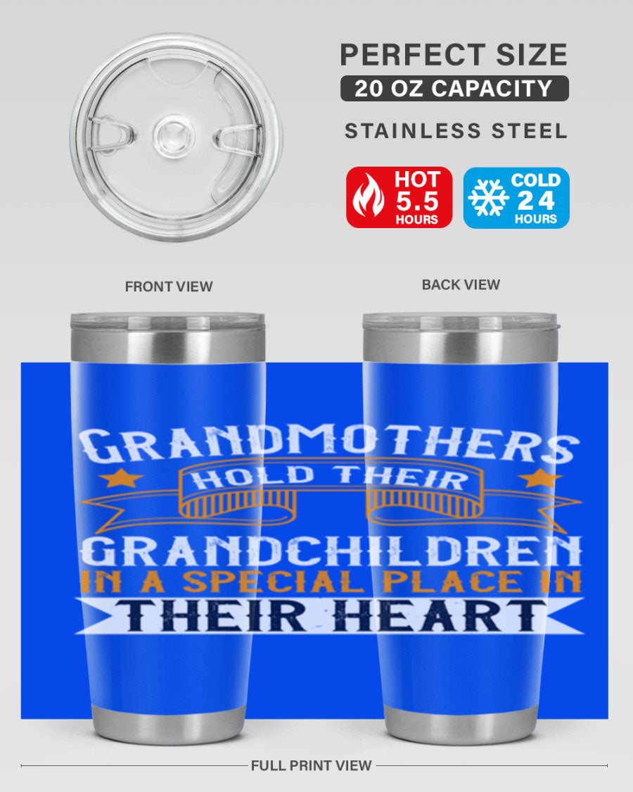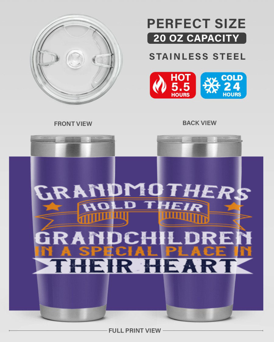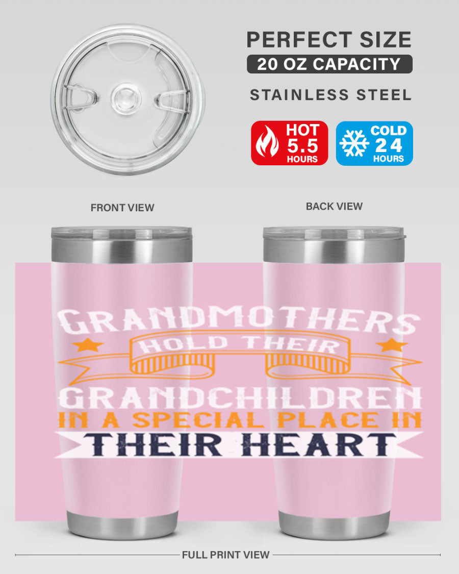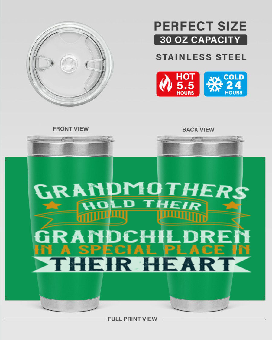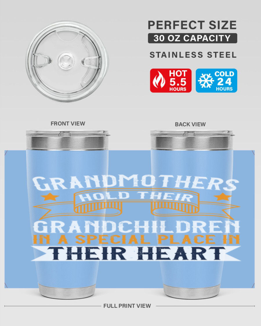 A beautifully designed stainless steel tumbler featuring a heartfelt message about grandmothers and their grandchildren, showcasing its double wall vacuum insulation.