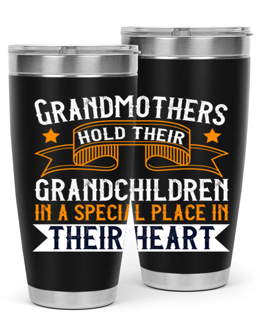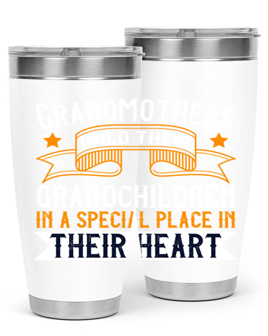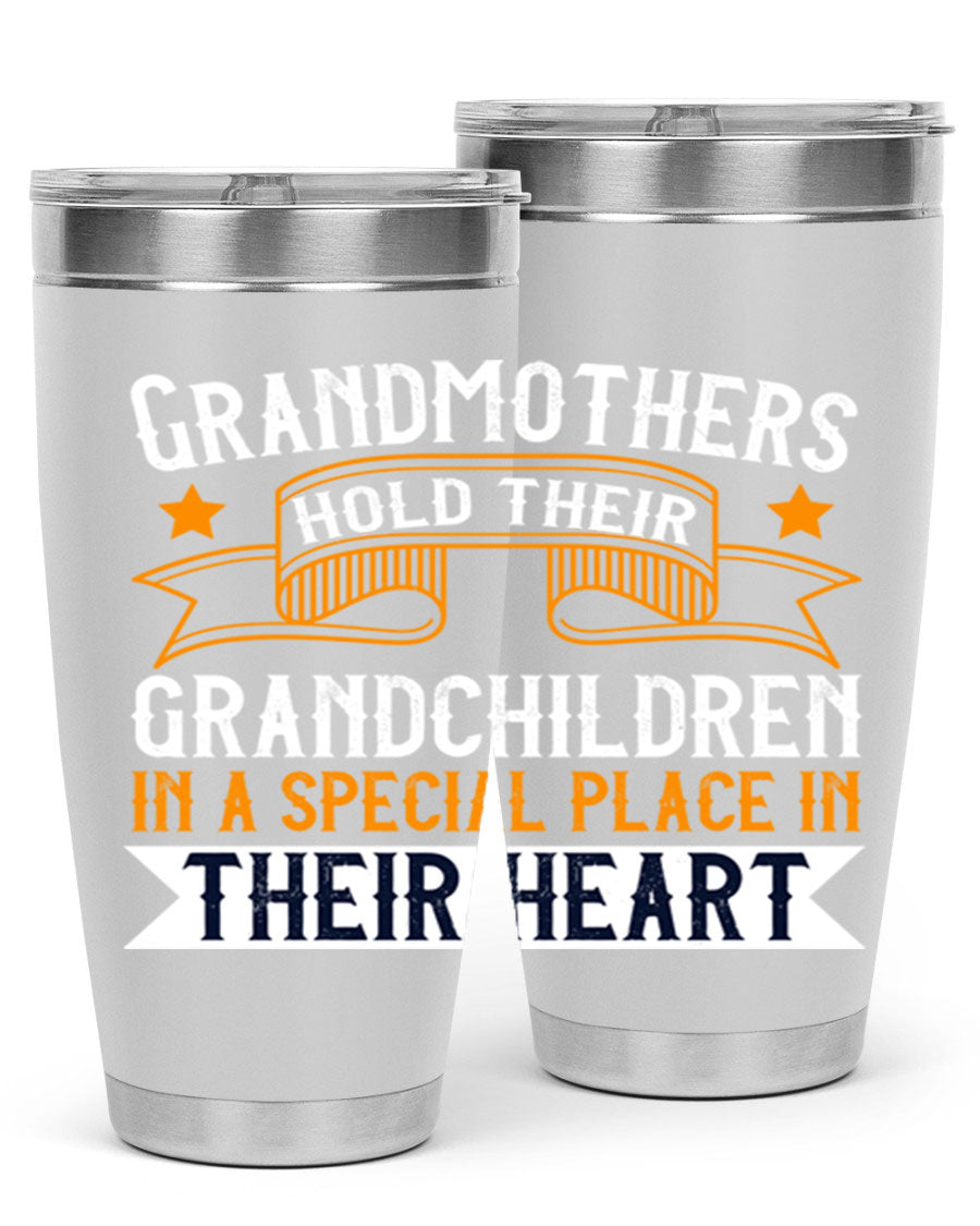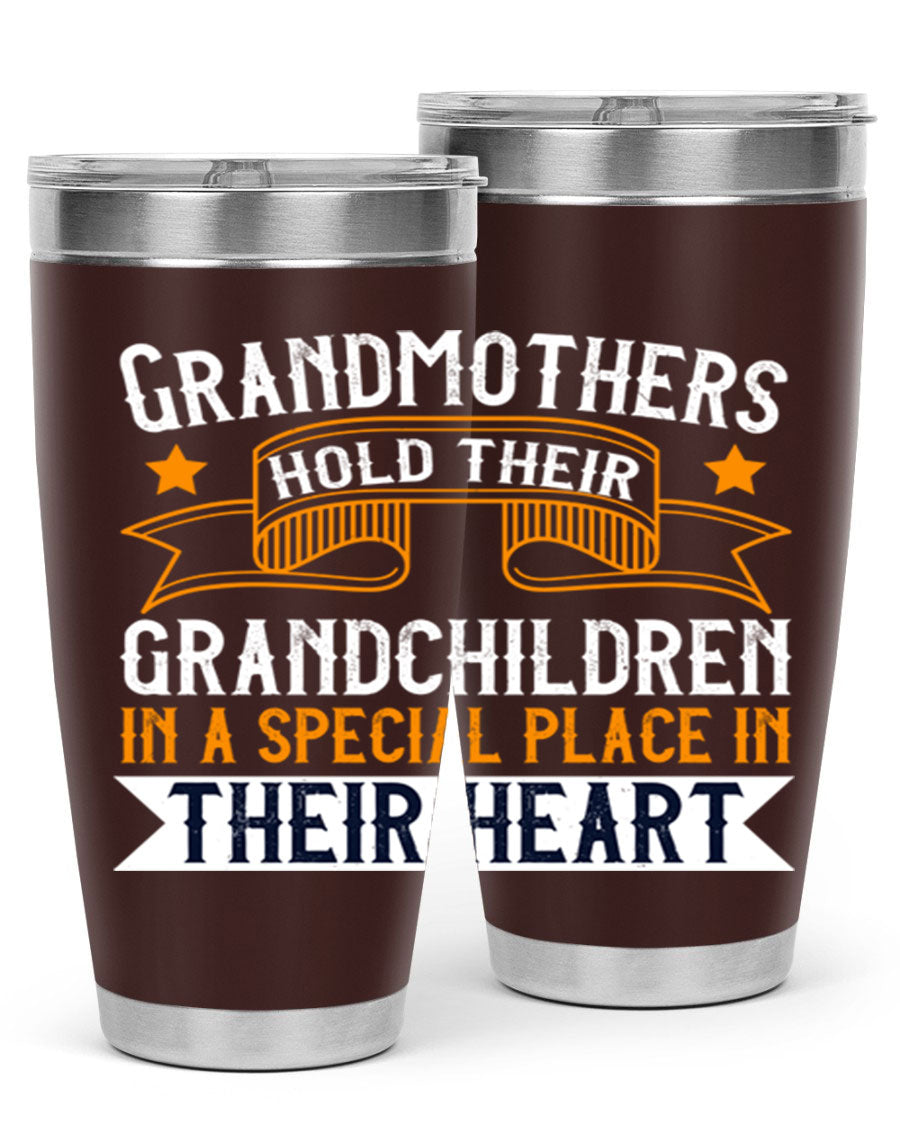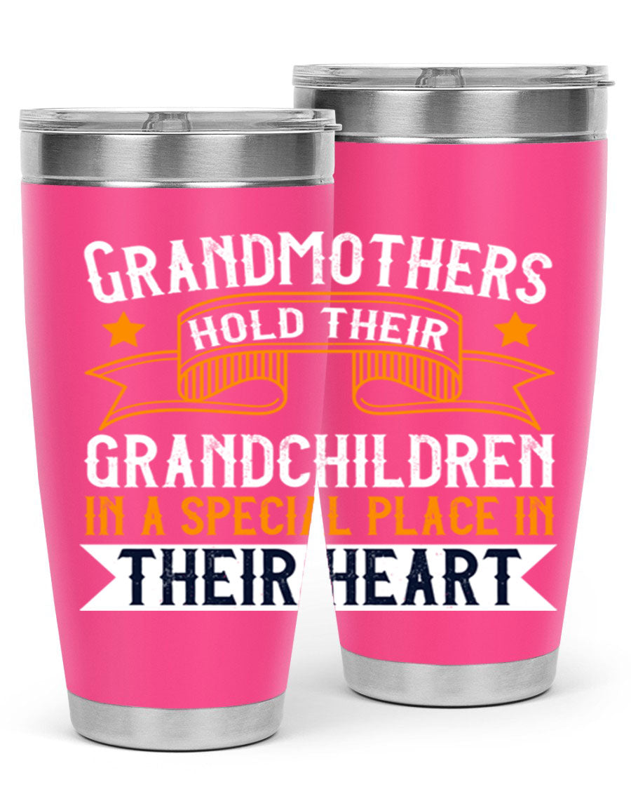 A beautifully designed stainless steel tumbler featuring a heartfelt message about grandmothers and their grandchildren, showcasing its double wall vacuum insulation.
