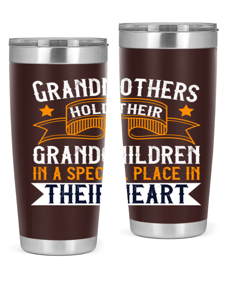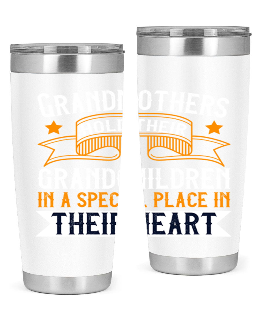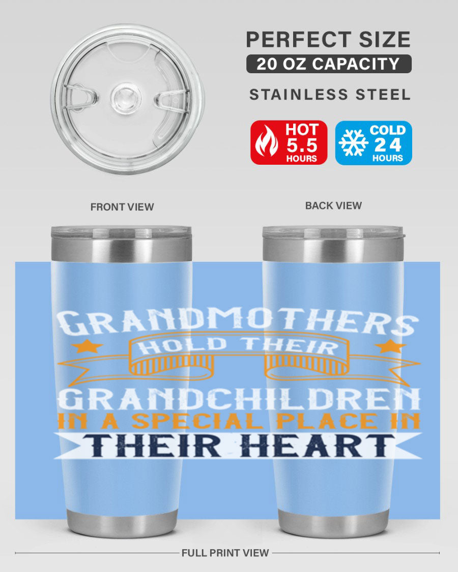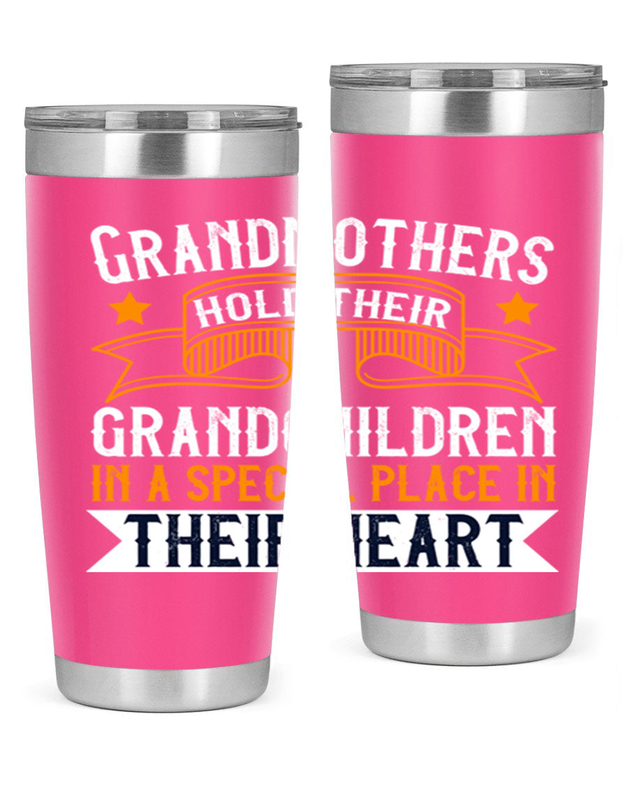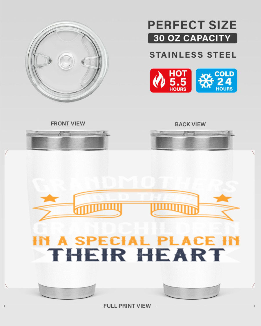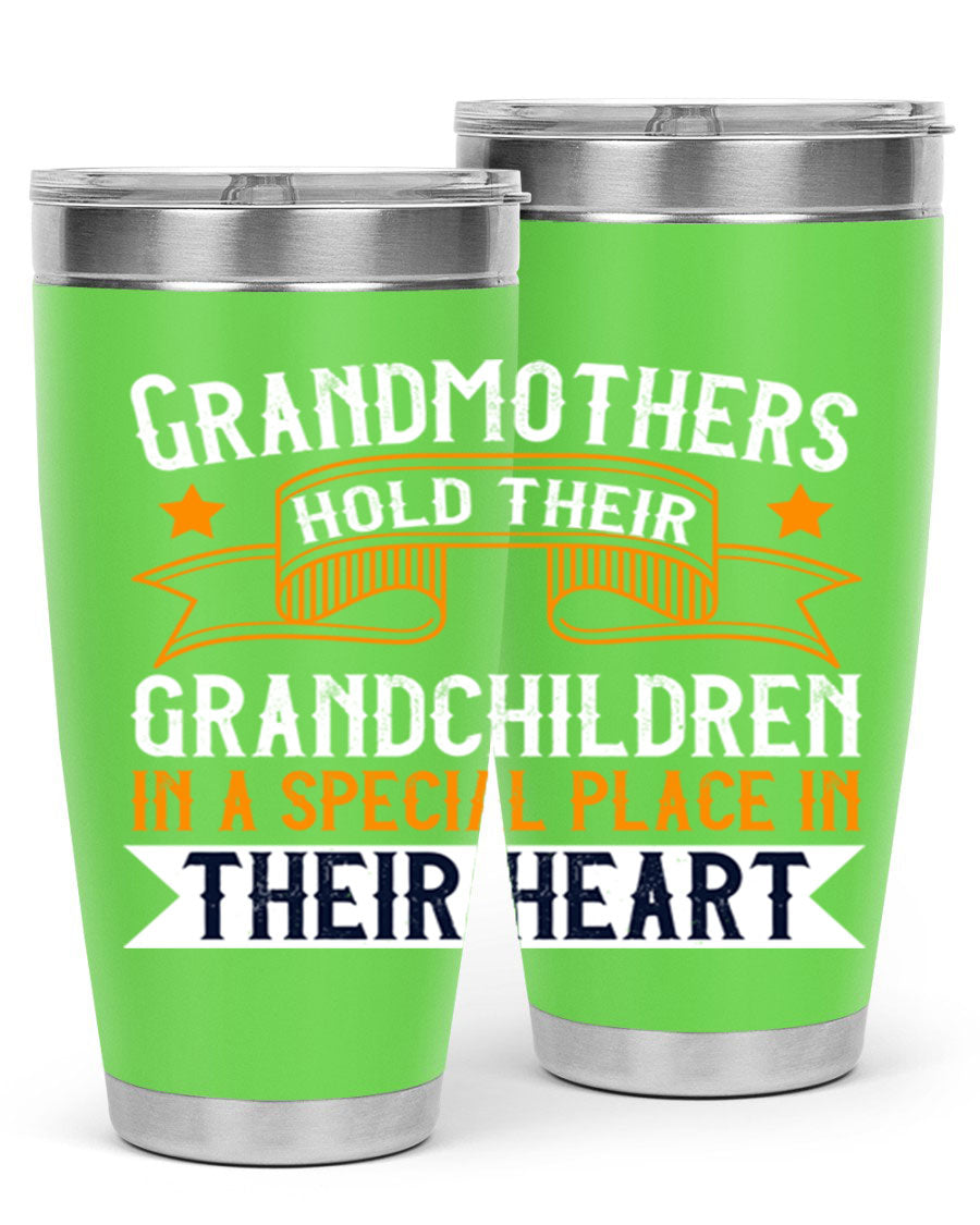 A beautifully designed stainless steel tumbler featuring a heartfelt message about grandmothers and their grandchildren, showcasing its double wall vacuum insulation.
