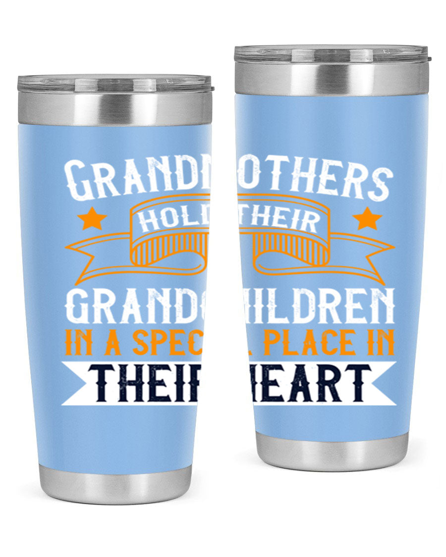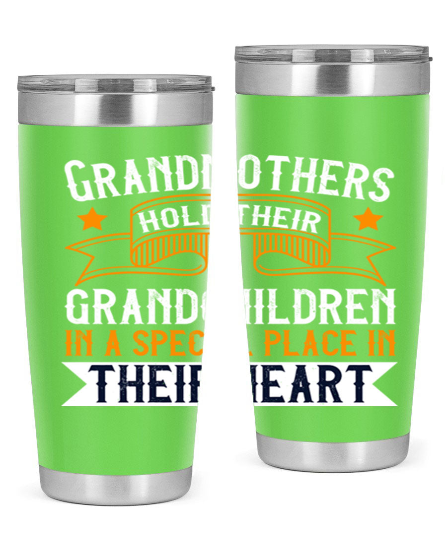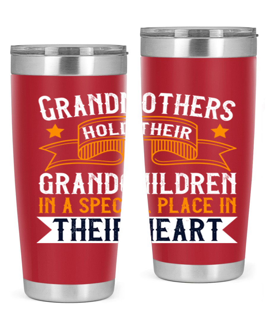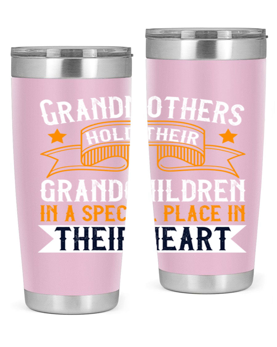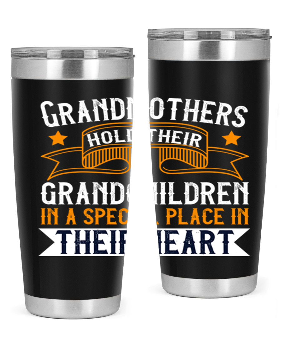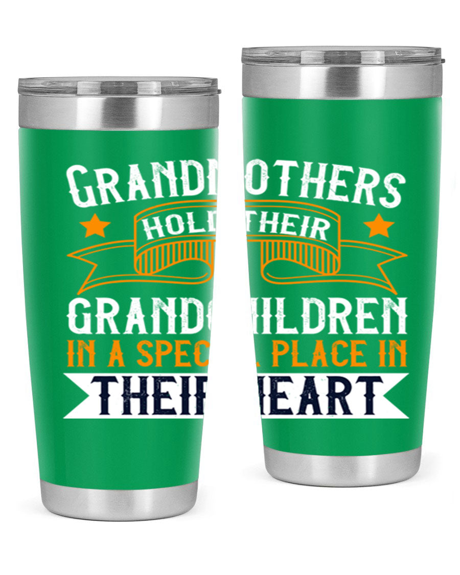 A beautifully designed stainless steel tumbler featuring a heartfelt message about grandmothers and their grandchildren, showcasing its double wall vacuum insulation.