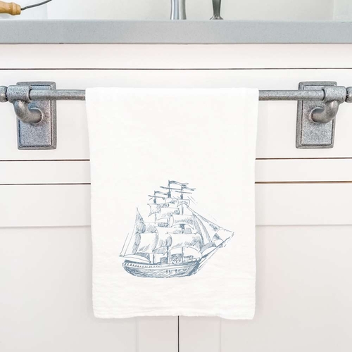 Our Hand Drawn Ship tea towel is crafted from premium quality cotton, known for its absorbency and durability. The 'flour sack' style with hemmed edges enhances its aesthetic appeal while providing a sturdy and reliable kitchen accessory. Whether you are drying dishes, wiping spills, or using it as a decorative piece, this tea towel is designed to meet your needs.