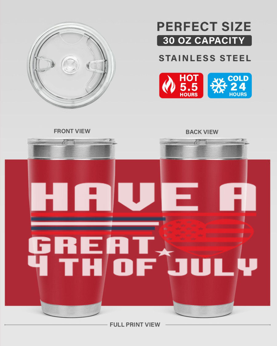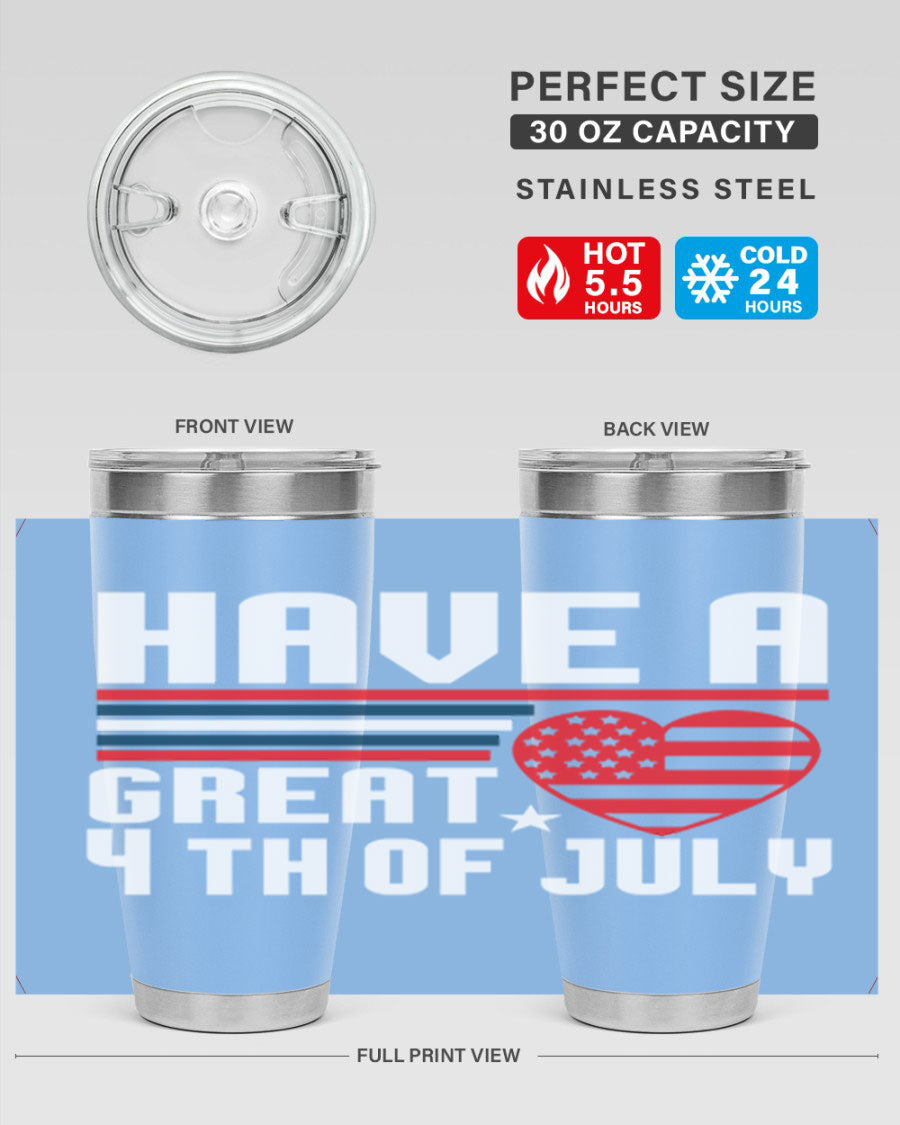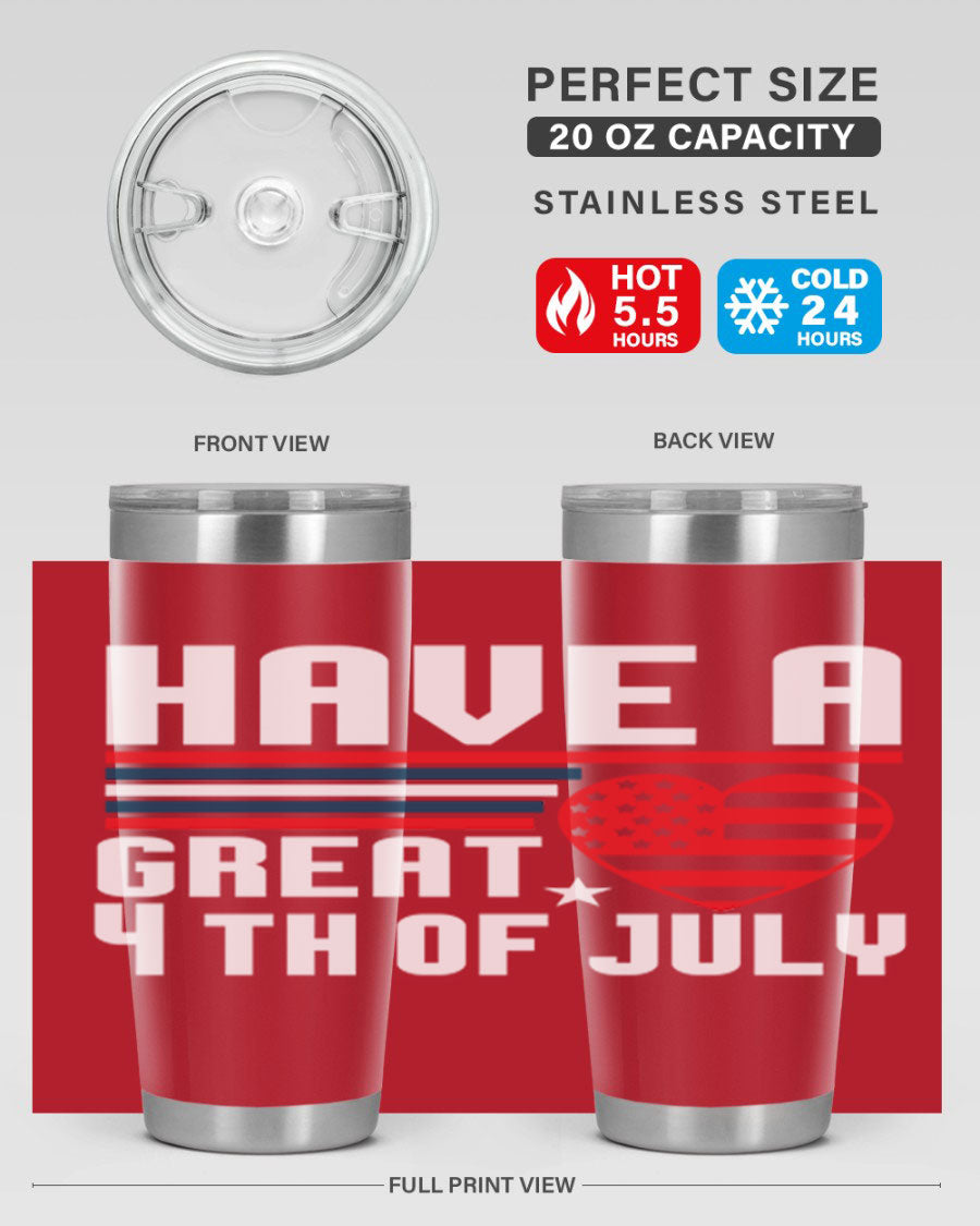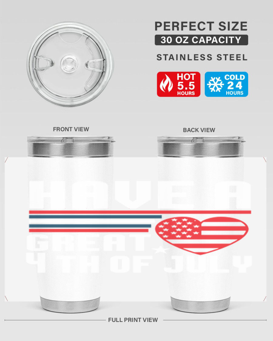 Introducing the Have a Great 4th of July Style 108# Tumblers, your perfect companion for celebrating Independence Day! These tumblers come in two sizes, 20oz and 30oz, designed to keep your favorite beverages at the ideal temperature for hours. Whether you're enjoying a hot cup of coffee during a morning barbecue or sipping iced tea on a sunny afternoon, these tumblers are crafted to meet your needs.