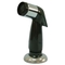 The black kitchen side sprayer features a chrome layering on the headpiece with a one-touch button behind it to activate water to flow through the small nozzles at the face of the headpiece. The water sprays a powerful stream of water effectively making c
