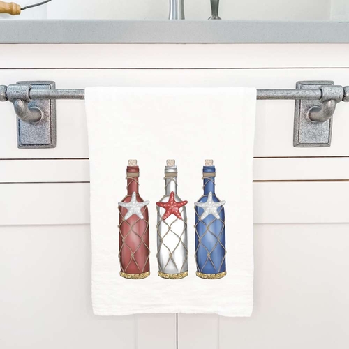 Our Patriotic Bottles cotton tea towel is not just for drying dishes. It can be used in various ways around the home. Use it as a table centerpiece, a gift wrap for baked goods, or even as a picnic blanket for outdoor gatherings. Its versatility makes it a valuable addition to any kitchen.