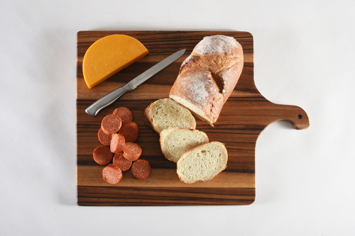 functional addition for any food prep, serving and entertaining purpose. Made from solid acacia wood, known for its durability and distinct grain patterns, this board is built to withstand the demands of daily use. With its convenient and beautiful handle, our board is effortlessly portable. The handle is thoughtfully shaped to provide a comfortable grip, ensuring safety and control while carrying or serving. Measuring 17" x 14" (including the handle), this cutting and charcuterie board provides ample space for any chopping, slicing, and serving needs while the solid construction ensures a sturdy and stable surface. Each piece is meticulously handcrafted to highlight the natural beauty of the acacia wood, ensuring that every board is unique and possesses its own distinct character. We recommend hand-washing with mild soap and warm water to maintain its beauty and integrity for years to come. To preserve the wood's natural luster, occasional oiling with food-grade mineral oil is recommended. |