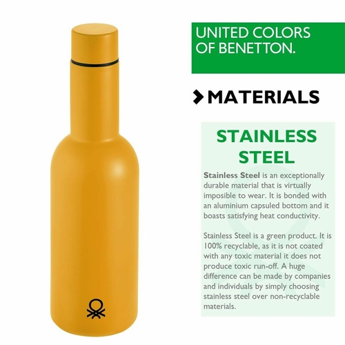 Made of high-quality stainless steel, this reusable Casa Benetton bottle is a sustainable choice that you can refill and wash as often as you like. Odourless, stain-free, and with a clean taste, it has the perfect spout size for spill-free drinking. Thanks to its design and size, it is perfect for the office, beach, pool, travel or outings. In addition, this bottle can be kept warm or cold for a long period of time.