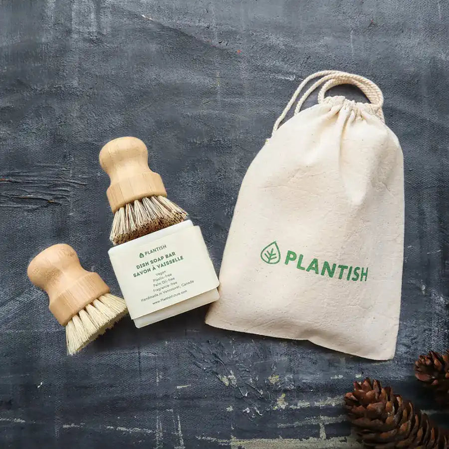 Zero Waste Dish Soap Set featuring bamboo-handled brushes and a cotton bag, promoting sustainable cleaning.