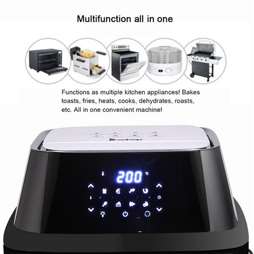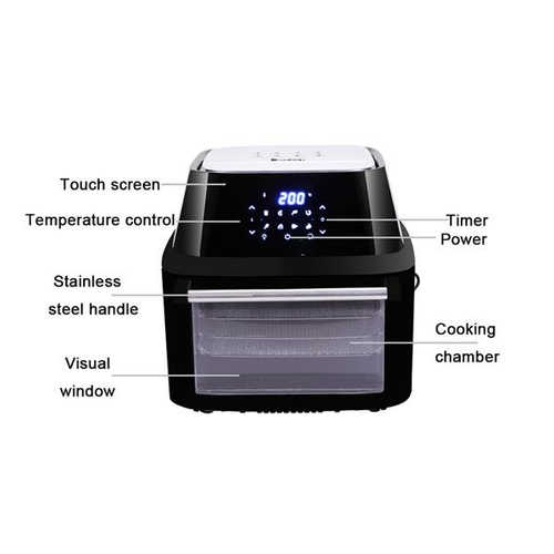 All-in-One Air Fryer, Oven, Rotisserie, and Dehydrator With the Large Air Fryer you are on your way to healthy eating without sacrificing on taste or flavor. Cook, fry, grill and bake without the need for butter, oil or other unhealthy fats. With Rotisserie Chicken Fork, it could cook 3kgs( 6pounds ) Chicken with crisp outside and juice inside. Each Deluxe Air Fryer Oven comes with a fry pan (drip tray), three fry net, chicken fork , rotating basket , skewer rack , fetch rack. Double layer window with inside glass and outside transperant PC. Power Lighting inside, give you a good vision and cool touch.