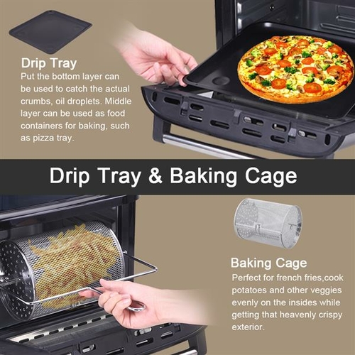 3. 8 Accessories allow you to do more than fry , one of the best parts about the Air Fryer Oven is its versatility. With the 8 included accessories, each Deluxe Air Fryer Oven comes with a Fry Pan (Drip Tray) , three Fry Net, Chicken Fork , Rotating Basket , Skewer Rack , Fetch Rack