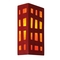 The Grid Wall Sconce features a rectangular box lantern design with colored panes of glass framed by asymmetrical grid lines on three sides. Light shines through openings at the top, the bottom and creates a warm glow through the glass. Handmade to A19's