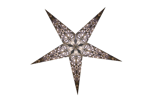 This larger sized 5-tipped paper starlight combines delicacy of design with a boldly contrasting colour scheme. An Antique White screen printed detail stands out against a black background, and its light is softened by white tissue paper inserts. This larger sized hand-made star lacks none of the delicacies of our smaller designs and illuminates a room softly without dimming it.