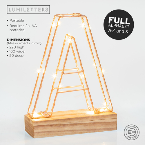 Lumiletters are 22cm (8”) tall and are handmade from copper / rose gold coloured metal wire frames wrapped with super bright LED's and a concealed battery compartment in the wooden base.