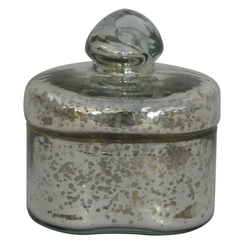 IN109 - Petite Vintage Styled Jar. This beautiful little silver glass jar has a decorative metal lid with a battered effect. Its shape reflects the light from different angles and will make a great addition to your antique silver glass collection in any part of the home. It can be used to store little bits and pieces like jewelry, sweets, or coins and will also make a lovely gift for friends and family.