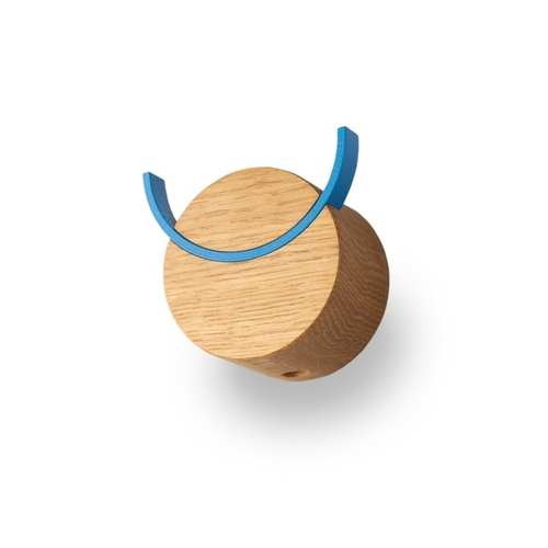 MATERIALS. Solid oak wood, blue painted stainless steel.