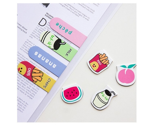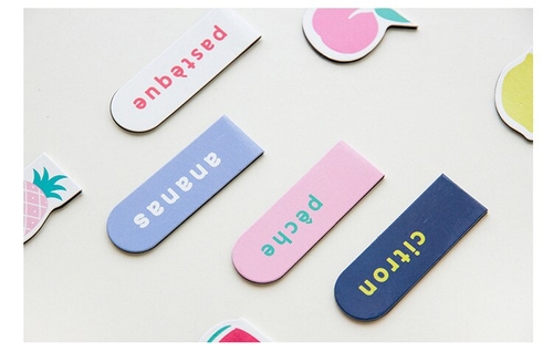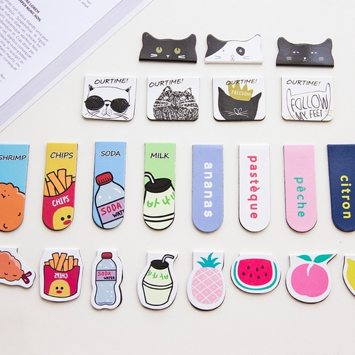 Type: bookmark Material: Metal Design: cartoon Material: Magnetic Material size: as pic shown pattern type: chips, cat, lemon, peach