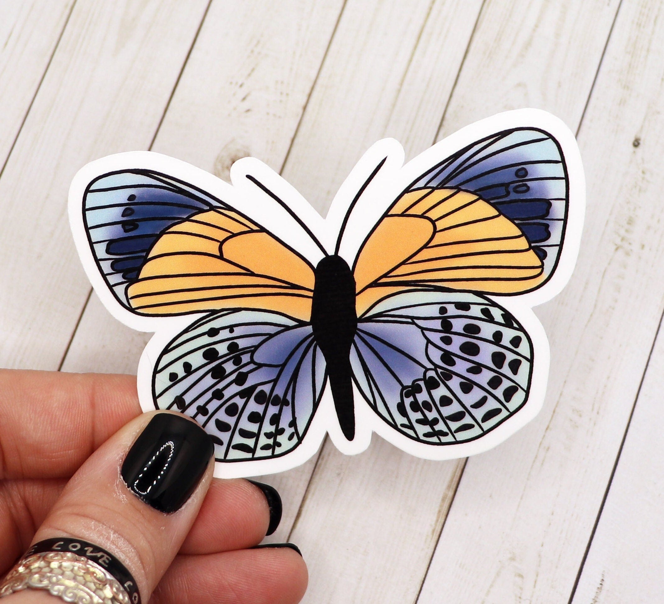 Introducing our stunning Blue and Yellow Butterfly Vinyl Sticker, a delightful addition to your collection of decorative stickers. Measuring 3 inches (7.62 cm) at its widest point, this sticker is designed to bring a splash of color and personality to your everyday items. Whether you want to jazz up your water bottle, planner, journal, skateboard, laptop, or notebook, this butterfly sticker is the perfect choice.