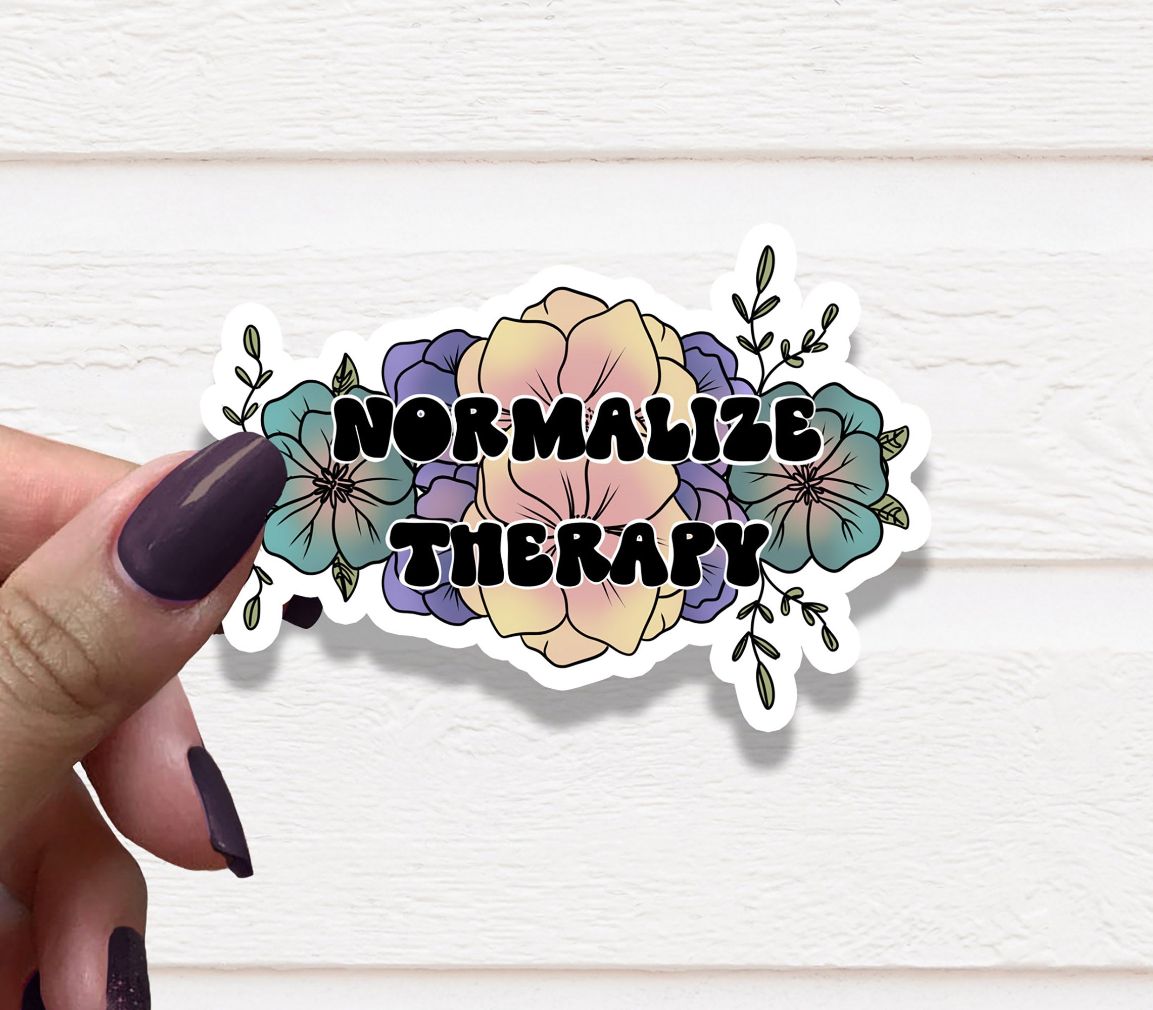 Introducing the Normalize Therapy Vinyl Sticker, a stylish and meaningful addition to your personal items. Measuring 2.5 inches (6.35 cm) at its widest point, this sticker is designed to make a statement while providing durability and protection. Whether you want to personalize your water bottle, planner, journal, skateboard, laptop, or notebook, this vinyl sticker is the perfect choice.
