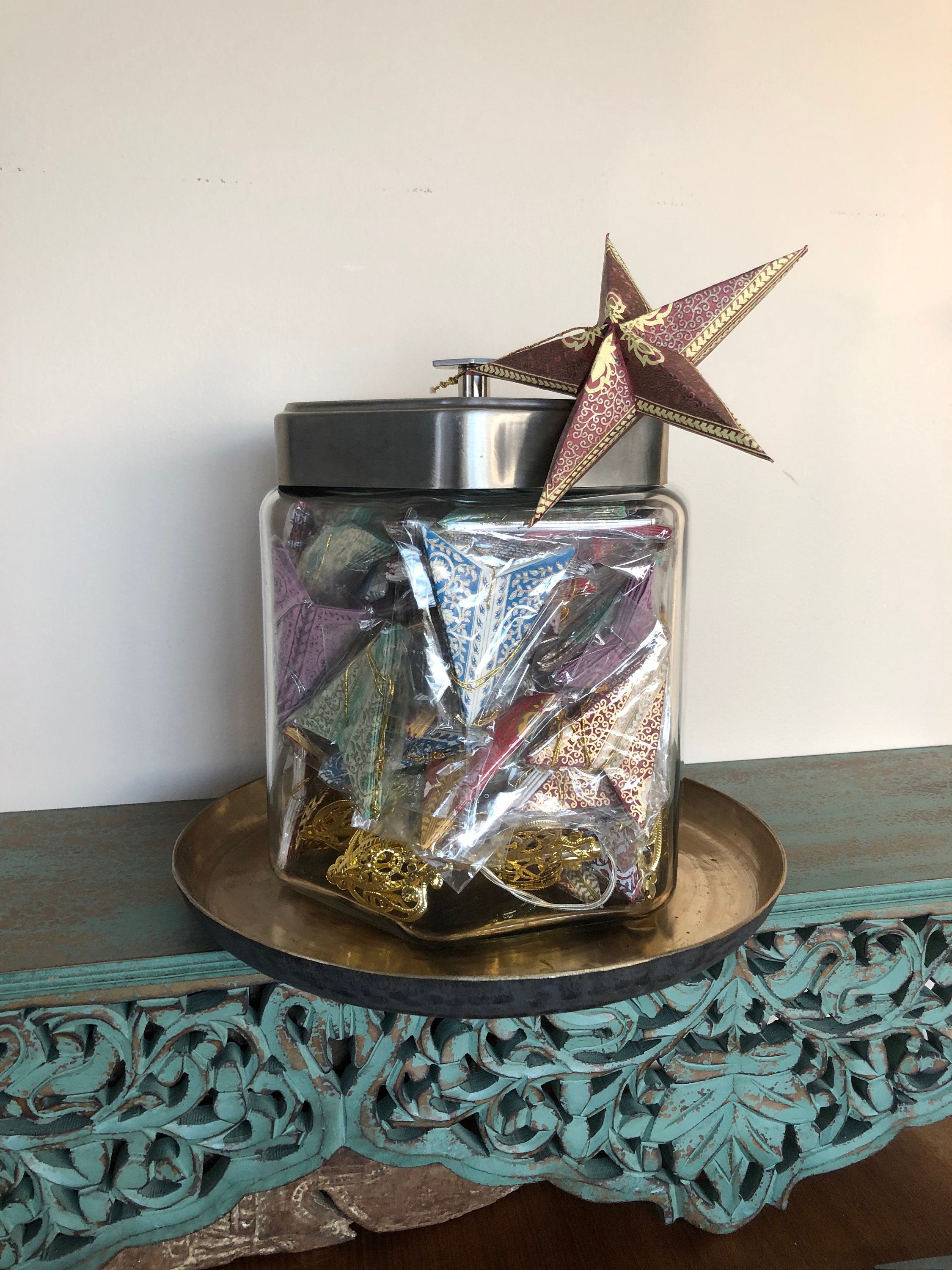 While the Paper Star Ornaments are stunning on their own, they can also be paired with other decorative items to create a beautiful display. Please note that the glass jar, accessories, and brass lamp shown in the images are for display purposes only and are not included with the product. To maintain the beauty of your ornaments, keep them away from direct sunlight and moisture.