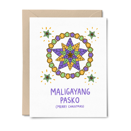 Usher in the holiday season with our exquisite Parol Filipino Christmas Lantern greeting card. This card beautifully captures the essence of Filipino Christmas traditions, featuring a stunning illustration of a parol, a traditional Filipino lantern that symbolizes hope and light during the festive season. Below the vibrant drawing, the card reads 'Maligayang Pasko,' which translates to 'Merry Christmas' in Tagalog, adding a personal touch that resonates with Filipino culture.