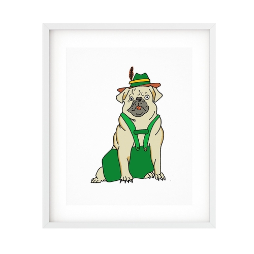 Introducing the delightful Pug in Lederhosen print, a charming piece of art that adds a touch of whimsy to any room. This playful illustration features an adorable pug dressed in traditional lederhosen, making it a perfect gift for both children and adults. Whether you're looking to decorate a nursery, home office, dorm room, or entryway, this colorful print is sure to bring joy and cheer to your living space.