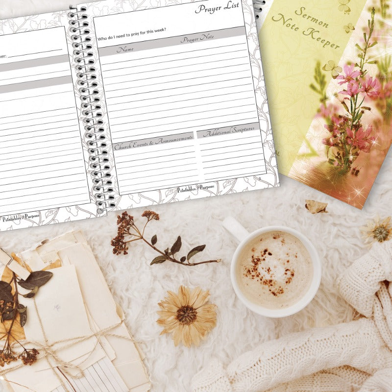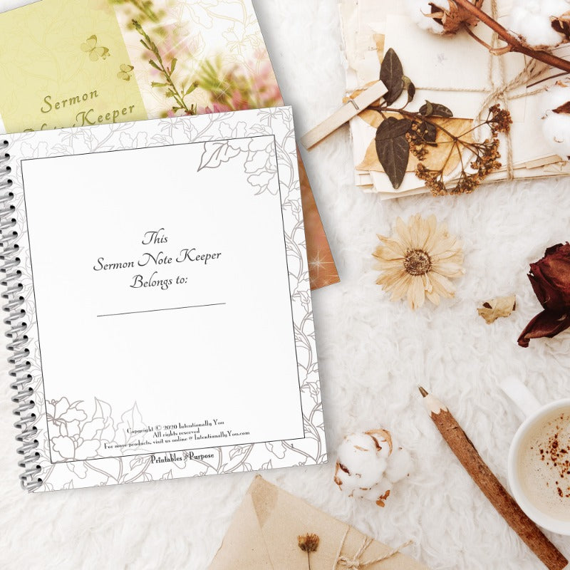 Say goodbye to stacks of paper programs and random slips of paper in your purse. The Sermon Note Keeper allows you to keep all your notes in one place, making your study sessions much more organized. No more digging around in your bag to quickly jot down a profound statement from your Pastor. With this journal, you can focus on studying the Word instead of trying to make sense of scattered notes.