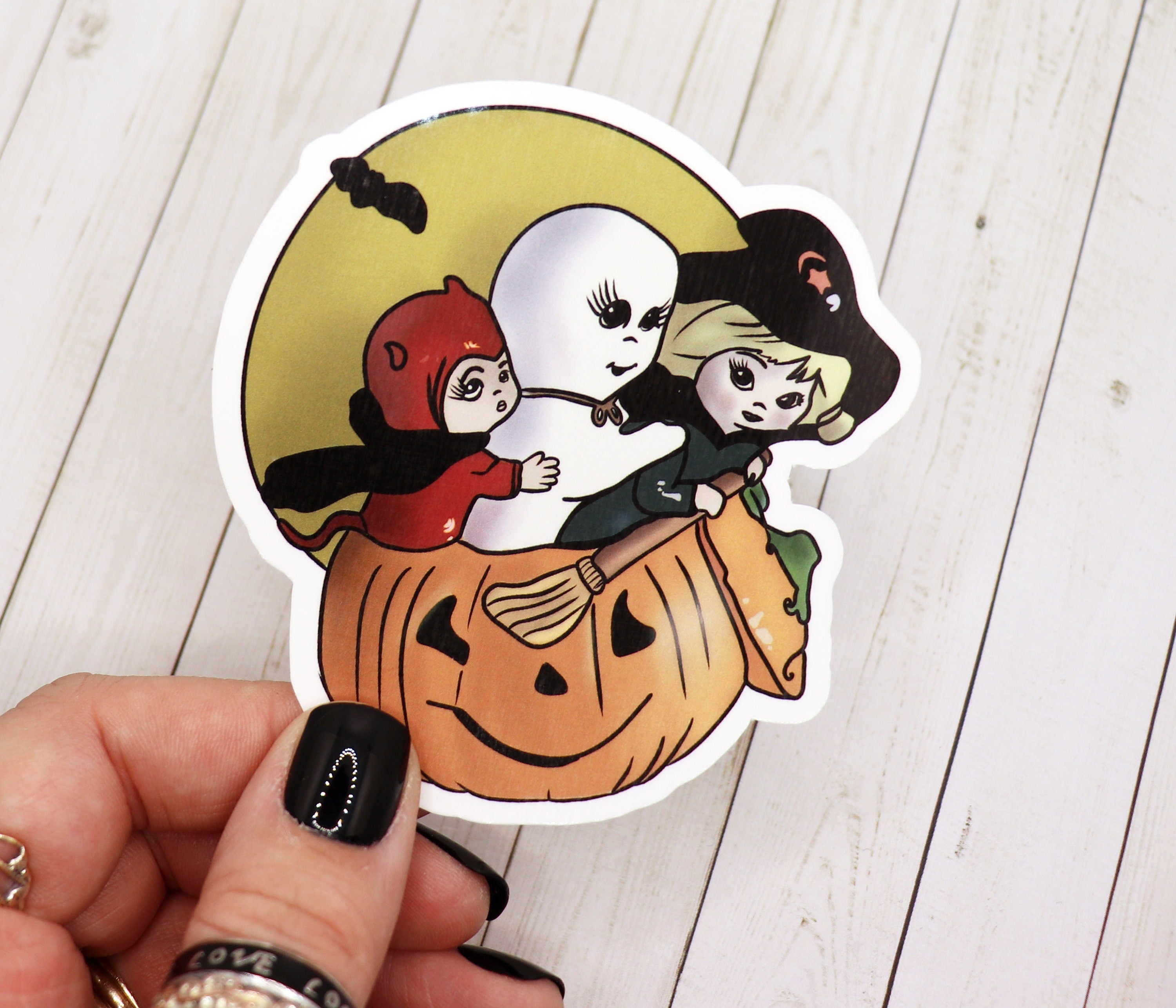 Cute vinyl Halloween sticker featuring festive designs, perfect for personalizing items.