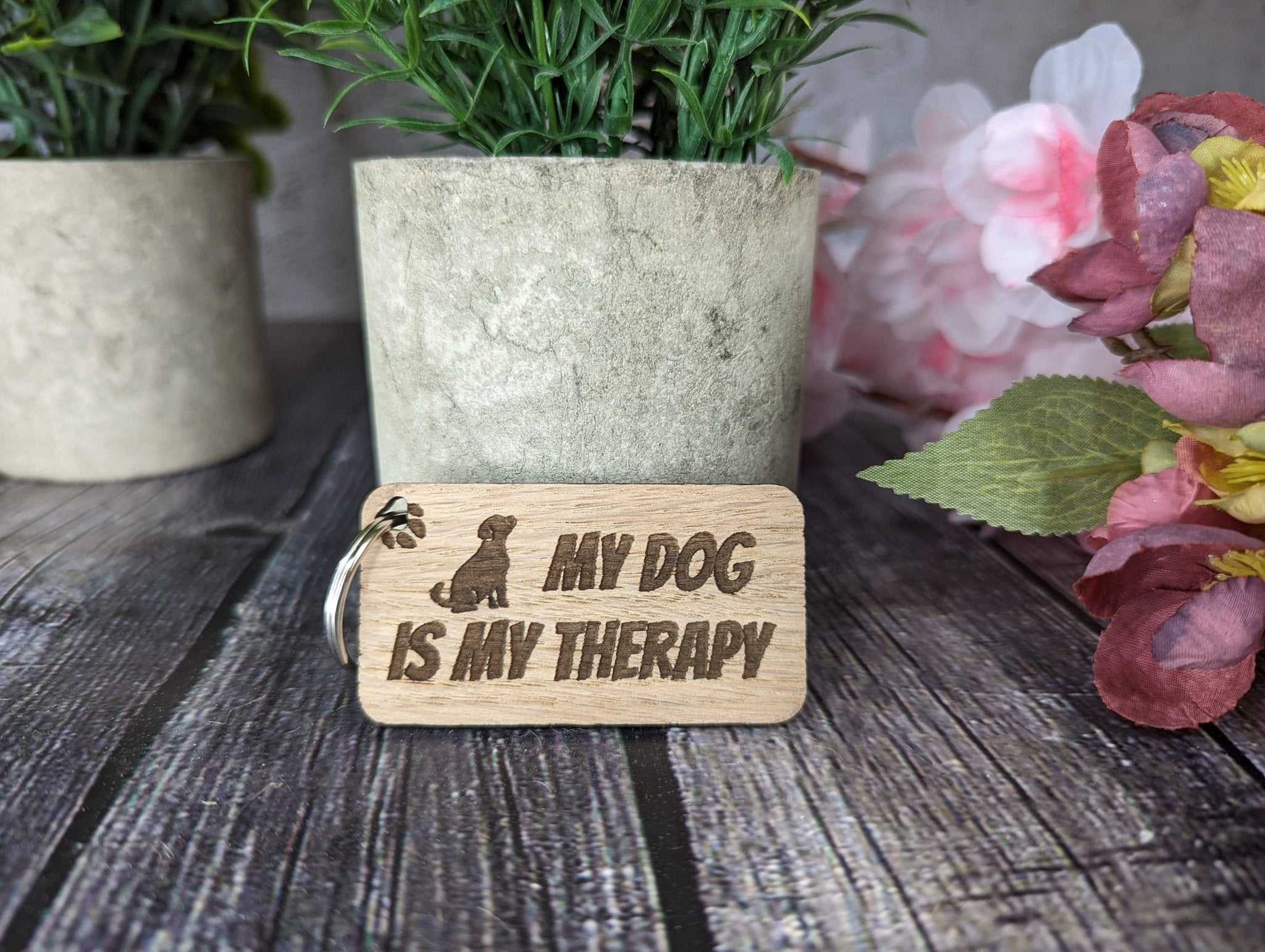 In summary, our eco-friendly wooden keyring with the message "My Dog is My Therapy" is a perfect blend of style, durability, and environmental consciousness. It serves as a daily reminder of the joy and comfort that dogs bring into our lives. Whether you're treating yourself or gifting it to a fellow dog lover, this keyring is sure to be appreciated.