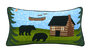 The 100% cotton lodge-inspired rectangle accent pillow honors the beauty of nature's majestic black bear. This richly-colored quilt pattern features a little chestnut-brown cabin nestled by a shimmering blue lake, surrounded by tall, forest-green pine trees. Two black bears pay a visit in the mossy-green field while a little canoe and two brown ducks float peacefully in the distance. The pattern is framed in a rich, green border with black accents and crafted using dense, thick cotton for strength and durability. Take a trip to a mountain lake without ever leaving your front door with our new quilted Bear River bedding! Coordinates with Donna Sharp Bear River Bedding Collection.